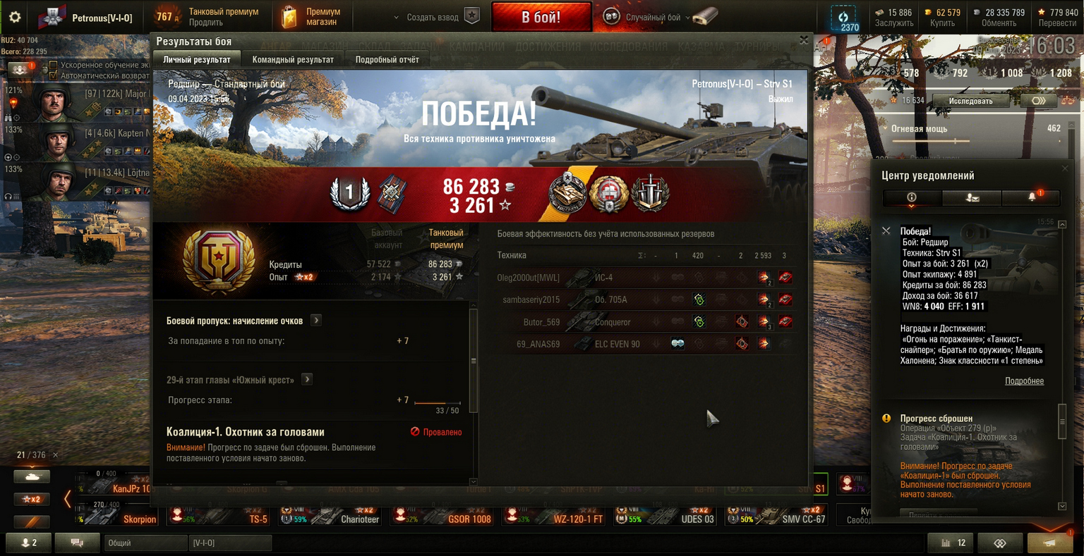 Победа! Бой: Редшир, Техника: Выжил под 2 артами и ИС-4 на Strv S1, Редшир, 2593урон, 3фраг, реализация 9-8-8 Опыт за бой: 3 261 (x2) , Опыт экипажу: 4 891, Кредиты за бой: 86 283, Доход за бой: 36 617, WN8: 4 040, EFF: 1 911, Награды и Достижения: «Огонь на поражение»; «Танкист-снайпер»; «Братья по оружию»; Медаль Халонена; Знак классности «1 степень»