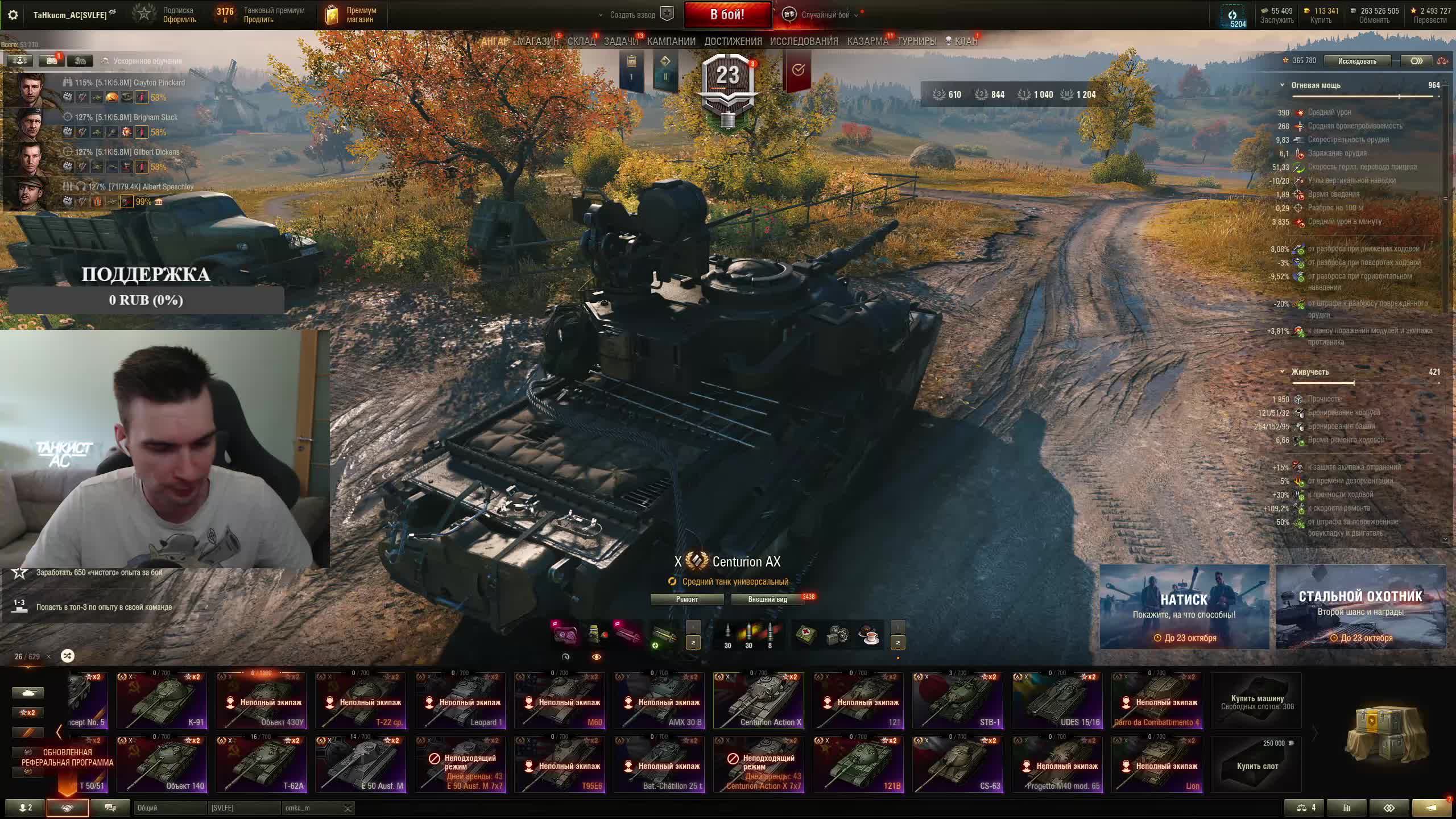 Поддержать стримера http://www.donationalerts.ru/r/tahkucm_ac Сбер без комиссии 2202 2062 2408 9735 напишите в чате, чтобы проверил Telegram https://t.me/TaHkucm_AC Канал Ютуб https://www.youtube.com/c/TaHkucmAC Канал VK Play Live https://vkplay.live/tahkucm Канал Бусти https://boosty.to/tahkucm Канал на трово https://trovo.live/TaHkucm_AC Канал Дзен https://dzen.ru/id/62355e95d406852937d33526 Группа Вконтакте https://vk.com/tahkucm_ac Оборудование и модернизации на все танки https://docs.google.com/spreadsheets/d/16koQOrtKQKQrAy2Pgfm6GBeG8bA1tJP_7Vm78knwUXA/edit#gid=422106233 Настройки игры в скринах https://dzen.ru/a/YmFvHhJ9yi3rZO5M Моды со скринами установки https://vk.com/topic-136212047_47639792 По поводу рекламы писать в личку https://vk.com/v_xarlamow Всем привет! Меня зовут Виктор, мой ник TaHkucm_AC. На моем канале стрим мира танков каждый день с 8 или 9 по мск. Так же иногда стримлю вечером в произвольное время, чтобы не пропустить подпишитесь на оповещения в телеге или вк (ссылки выше). Играю в танки с декабря 2011 года, а стримить начал в начале 2017 года. Во время стримов общаюсь с чатом, помогаю советами по игре, объясняю тактику. Средняя статистика 65% побед и 4-5к вн8. Фан кланы SLPFR - Командиры marmyn и artlay - из требований только то, чтобы вы часто играли в танки. Укреп 10 уровня. Участвуют в ивентах на ГК, как минимум чтобы собрать пропуск на аукцион. L-DS - Командир DarkSpawn13. Укреп 10 уровня, плюхи по кд SVLFE - Командир Shadowlions. Требуется Team Speak (программа связи) для взводов и клановых покатушек. Участвуют в ивентах на ГК, как минимум чтобы собрать пропуск на аукцион. укреп 10 уровня