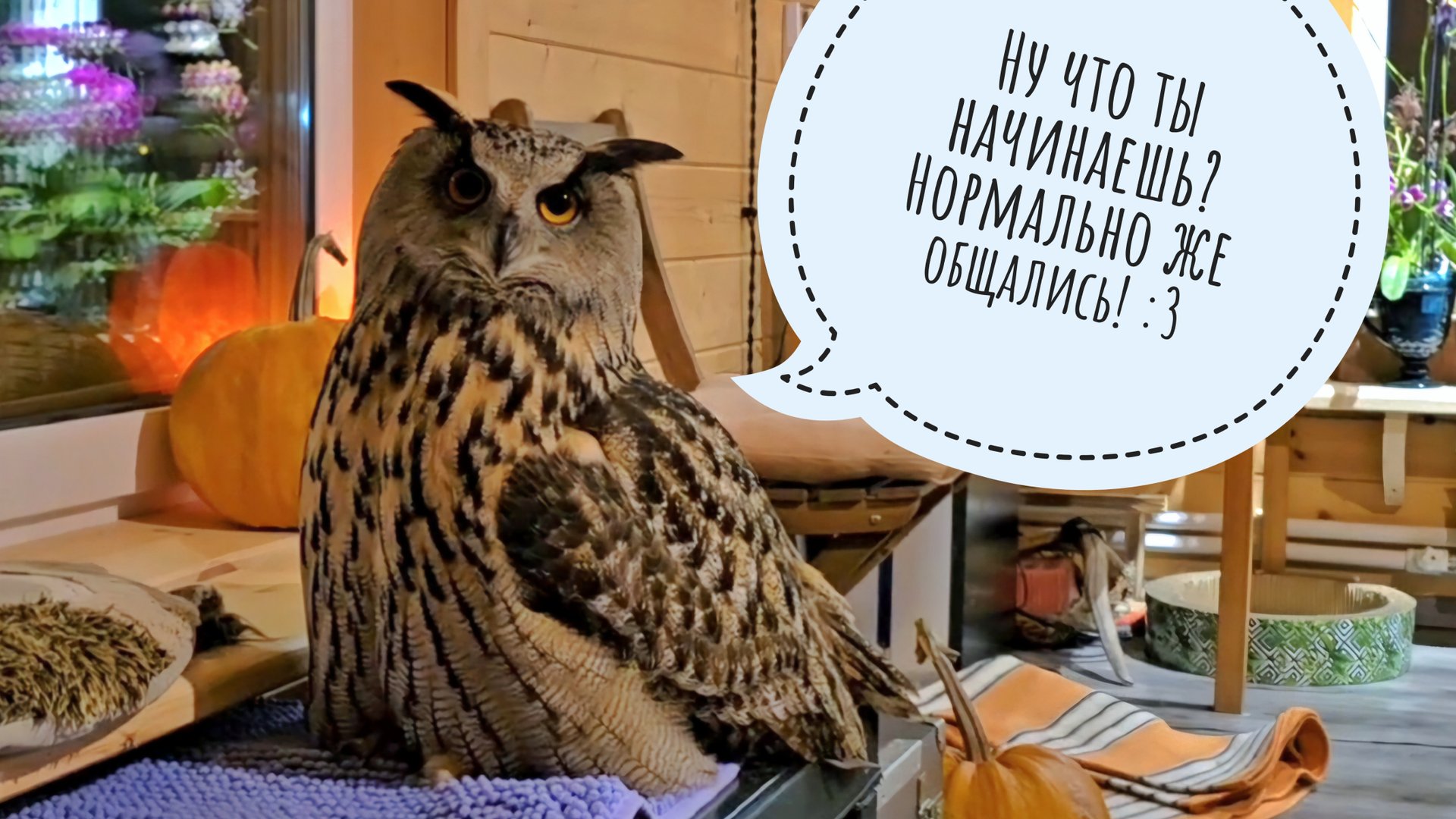 У нас уже ночь. Сова филин Ёль всё ещё сидит на жопоньке на коврике и не собирается уходить на улицу.