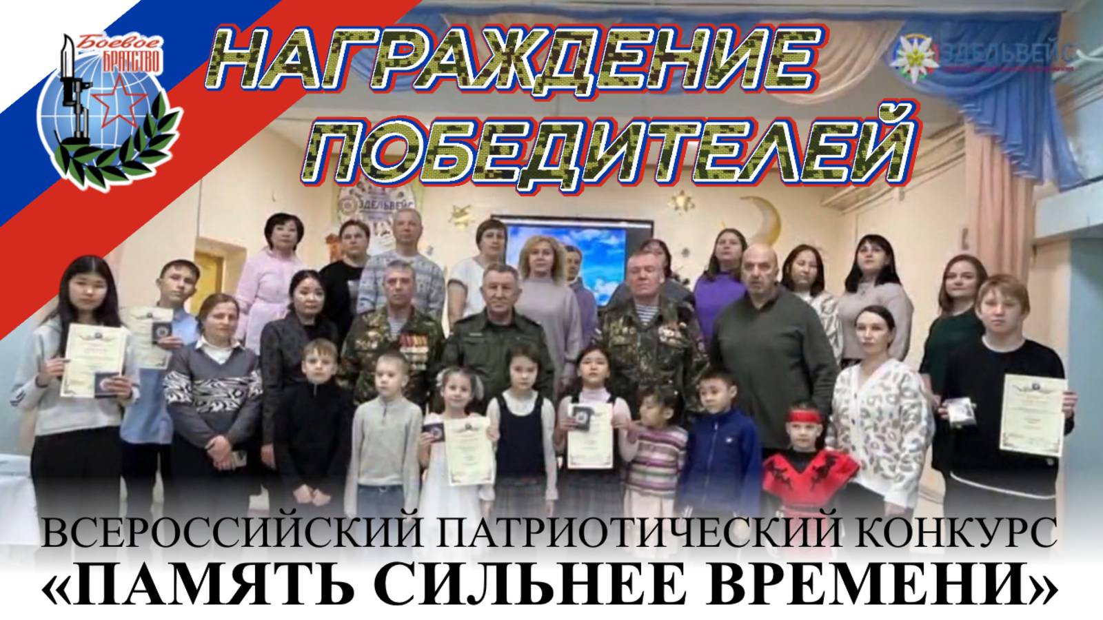 25 декабря в центре «Эдельвейс» для воспитанников и гостей прошло награждение победителей Всероссийского конкурса «Память сильнее времени». Дипломы и медали победителям вручали почётные гости: председатель Бурятского регионального отделения Всероссийской общественной организации ветеранов «Боевое братство», полковник Хлебодаров Николай Иванович (https://vk.com/id715506929), ветеран боевых действий, кавалер Ордена Мужества, начальник штаба БРО «Боевое братство» подполковник Плесовских Виктор Геннадьевич и заместитель руководителя БРО «Боевое братство» Машанов Александр Николаевич. Конкурс проходил с апреля по декабрь. Наши воспитанники создавали рисунки и писали эссе, которые затем были отправлены в Москву, где коллегиальным решением определены победители! Поздравляем всех с наступающим Новым годом! Желаем мирного неба над головой! Никто не забыт, ничто не забыто. 🙏