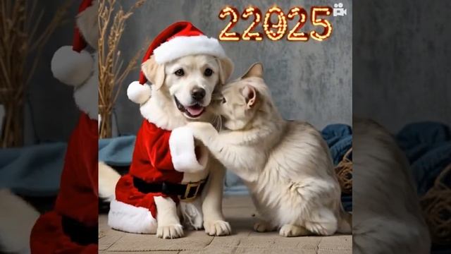 Милая собака и кот Дед Мороз