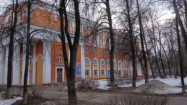 Красивое здание, огромные колонны и лепнина на фасаде ДК Сталинской застройки в Электростали