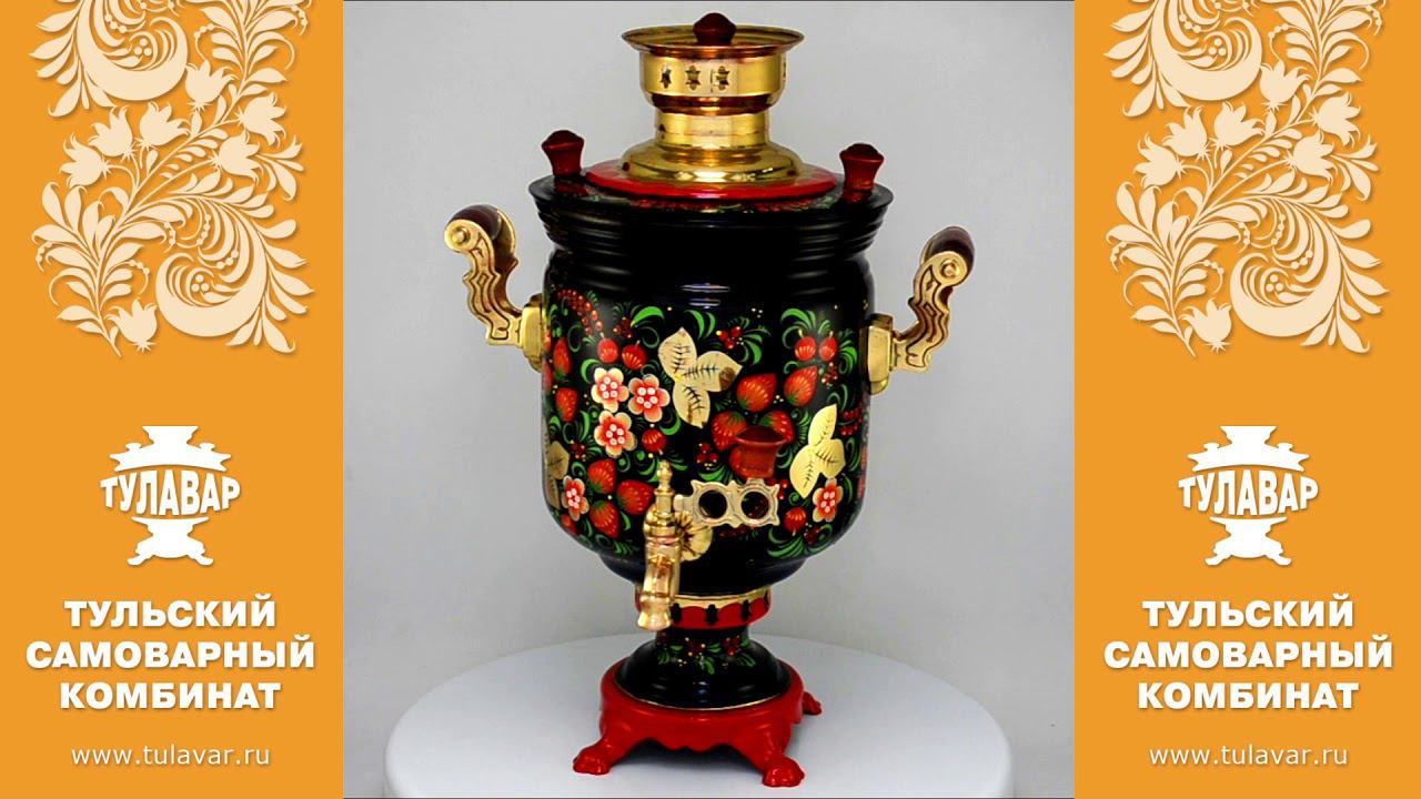 Ссылка на самовар в каталоге магазина ТУЛАВАР https://tulavar.ru/catalog/zharovye/raspisnye/0855.html Жаровой самовар формы банка на 5 литров с традиционной росписью. Роспись «Хохлома» выполняется художниками комбината полностью вручную. Ручки изготовлены из натурального дерева и покрыты лаком. Корпус также покрывается особым лаком. Он обеспечивает повышенную термоустойчивость, защиту поверхности самовара от перепада температур в течение многих лет эксплуатации. Материал - Латунь Производитель - г. Тула, ТСК ТУЛАВАР Гарантия - 5 лет Форма самовара - Банка Объем - 5 литров Время закипания - 20 - 25 минут Размер - 50 х 35 см Диаметр трубы - 65 мм Вес - 6 кг ГОСТы завода - Р 50959-96 Заказать самовар по телефону: +7 (950) 922-13-51 +7 (4872) 583-843 contacts@tulavar.ru https://tulavar.ru