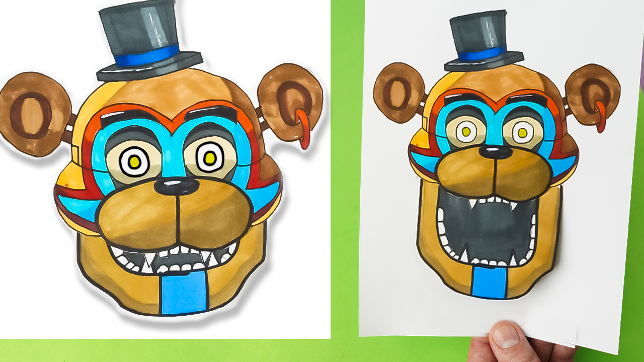 Всем привет вы на канале Поделки Самоделки давайте узнаем как сделать аниматроника Фредди из Фнаф 9 секьюрити брич, у которого будет говорящая голова, с таким аниматроником из бумаги можно сделать крутую поющую голову и снимать классные видео в тик ток. Классные поделки из бумаги ты всегда сможешь найти на нашем канале, а как тебе персонаж Гламрок Фредди. Для поделки Фредди Фнаф тебе понадобится плотная бумаги формата А5 для основной части головы и еще такой же лист бумаги для нижней челюсти которая будет двигаться. А еще черный линер и маркеры. Новая часть игры Фнаф 9 секьюрити брич, получилась очень яркой и занимает тренды, какие еще аниматроники из этой части Фнаф кроме Фредди тебе понравились напиши мы сделаем поделки из бумаги с ними.