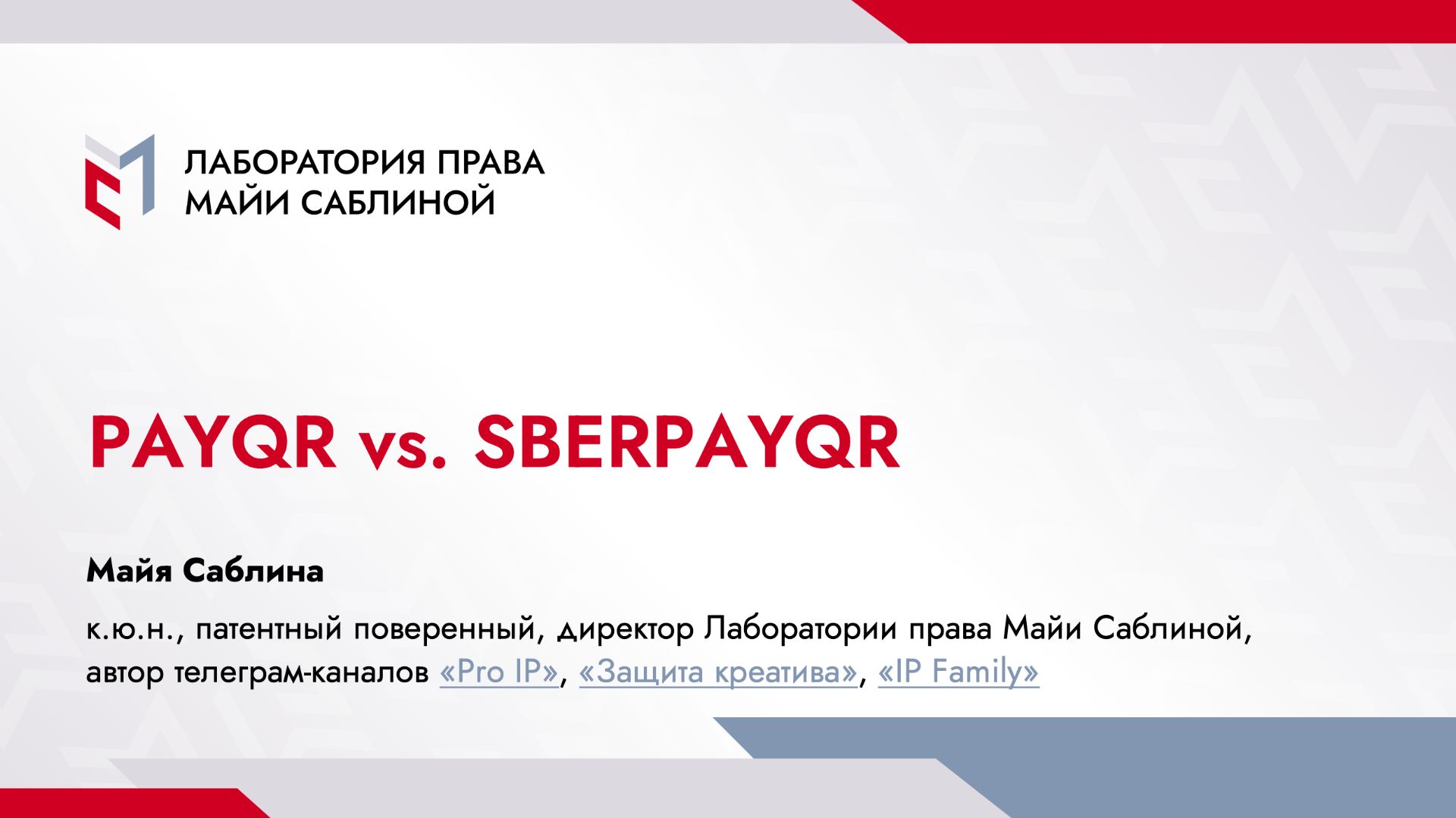 Лаборатория права Майи Саблиной организовала онлайн-дискуссию по нашумевшему в марте делу ФИТ vs. Сбербанк. 00:00-03:06 – приветствие 03:06-33:25 – предмет и основание иска 33:25-49:33 – позиции судов 49:33-52:40 – вероятность смешения 52:40-02:47:40 – дискуссия 02:47:40-02:48:43 – итоги 🔹 Как с нами связаться: msablina.ru +7 (995) 787-95-77 info@msablina.ru 🔹 Телеграм-каналы Майи Саблиной: Pro IP – https://t.me/ipmir Защита креатива – https://t.me/ipprotection IP Family – https://t.me/ipfamily 🔹 Мы в других соцсетях: Подкаст – https://mayaproip.mave.digital/ RUTUBE – https://rutube.ru/channel/40283977/ YouTube – @mslawlab TenChat – https://tenchat.ru/maya_sablina #IP #защитакреатива #бренд #логотип #товарныйзнак #патент #авторскоеправо #бизнес #интеллектуальнаясобственность #МайяСаблина #вебинар