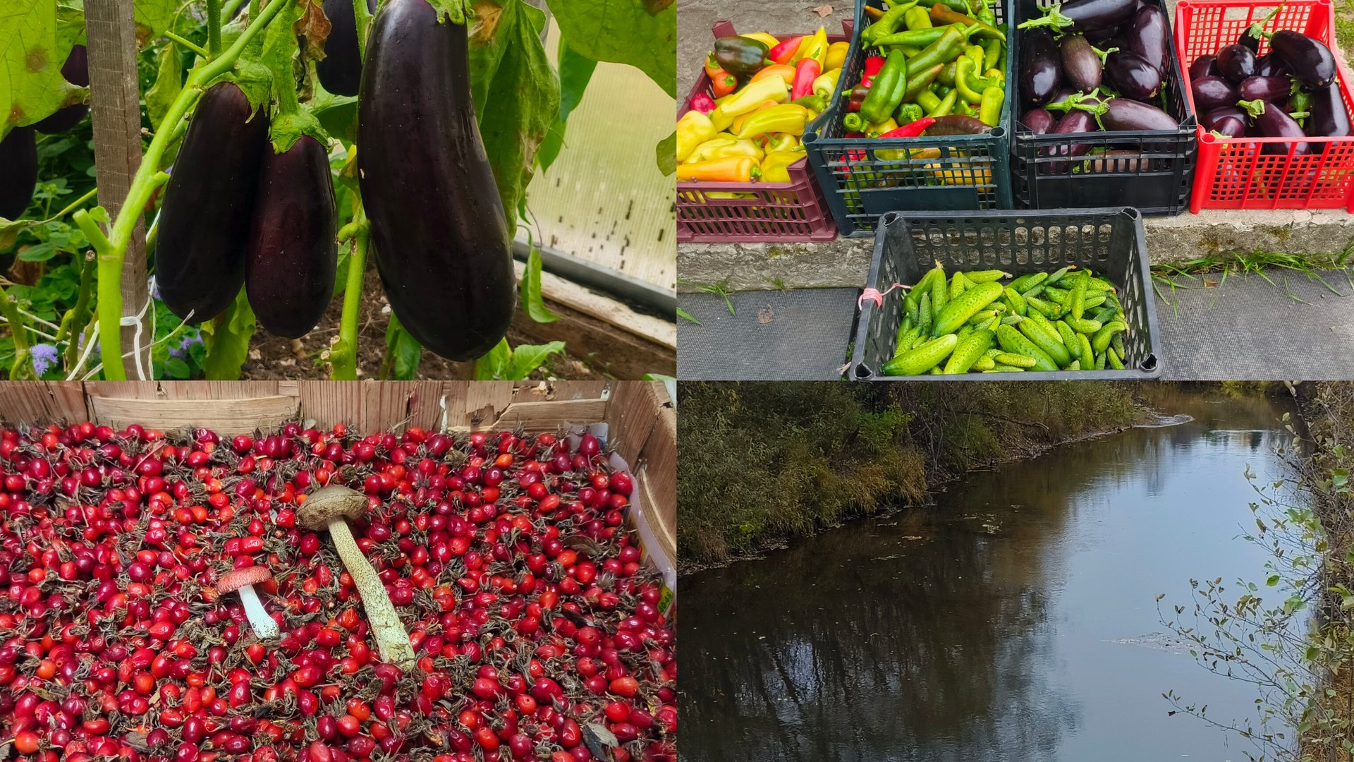 В теплице собрали огурцы ,перцы и баклажаны ,сходили к реке за шиповником .