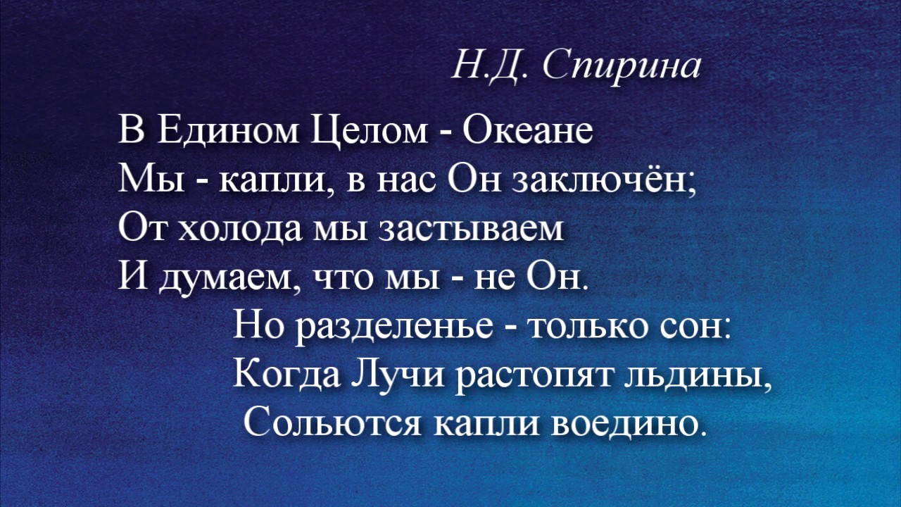 Наталия Спирина * * * В Едином Целом — Океане Мы — капли, в нас Он заключён; От холода мы застываем И думаем, что мы — не Он. Но разделенье — только сон: Когда Лучи растопят льдины, Сольются капли воедино. 5.04.1957 г. Читает автор. Из сборника «Капли» #НаталияСпирина, #ПоэзияНовойЭпохи, #ПоэзияСпириной -------------------------------------------- О Наталии Дмитриевне Спириной: Сайт, посвященный Н.Д. Спириной: https://spirina.info Раздел на сайте СибРО: http://sibro.ru/teacher/spirina/ Instagram: https://www.instagram.com/nataliya.spirina/ Telegram: https://t.me/SpirinaN видеофильмы: https://www.youtube.com/playlist?list=PLRDwJtqWLAx7zdjQRW1u5QSUW3T6SJ4rj -------------------------------------------- Помочь проектам СибРО: https://sibro.ru/dari-dobro/ Благодарим наших постоянных помощников! -------------------------------------------- Канал Сибирского Рериховского Общества и Музея Николая Рериха в Новосибирске https://www.youtube.com/channel/UCOy_IPfEW_uKJU7lY6HwEaA Канал Трансляции СибРО https://www.youtube.com/channel/UCtl9xwOporefIWfINDnFlKQ Сайт: https://sibro.ru Группы: VK https://vk.com/roerichmuseumnsk OK https://ok.ru/roerichmuseum FB https://facebook.com/roerichmuseumnsk IG https://instagram.com/roerich_museum_novosibirsk/ Книги издательства СибРО "РОССАЗИЯ": https://rossasia.sibro.ru/knigi/ Интернет-магазин "Искры Света": https://knigisibro.ru