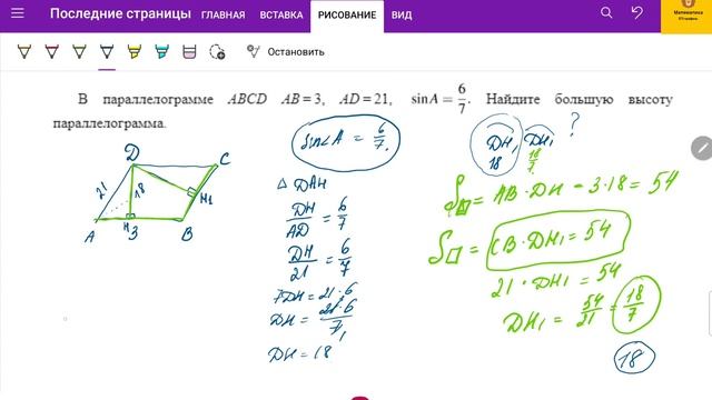 ТГ-канал: t.me/ege_oge_maths. Вся теория и практика для ПРОФИЛЬного ЕГЭ: https://stepik.org/a/123457. Много задач для самостоятельного решения с моментальной проверкой результата! Разбираем Задание 1 - геометрия в плоских фигурах профильного уровня. В видео решаем задачи: 1. В параллелограмме ABCD AB=3, AD=21, sinA=6/7. Найдите большую высоту параллелограмма. 2. Площадь прямоугольника равна 18. Найдите его большую сторону, если она на 3 больше меньшей стороны. 3. Найдите площадь ромба, если его высота равна 2, а острый угол 30 градусов. 4. Найдите площадь квадрата, если его диагональ равна 1.