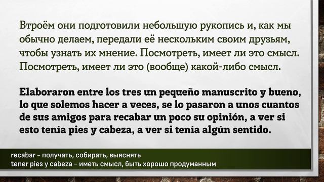 Данный материал предназначен исключительно в образовательных целях. Данный материал частично был синтезирован с помощью искусственного интелекта. Цель – заставить мышление учащегося формировать фразы, части фраз, на испанском языке. Каждая фраза повторяется три раза. Повторения происходит не подряд, а с некоторым "смещением", заставляя всё время мысленно переключаться на другую фразу. Пауза между фразами служит для того, чтобы вспомнить хотя бы одно слово, часть фразы или всю фразу на испанском языке. Чем длиннее фраза на русском языке – тем длиннее пауза до фразы на испанском языке. Достаточно, если человек самостоятельно начинает формировать хотя бы кусочки фразы, некоторые слова. Данный вид упражнений не стоит делать более одного часа за один раз. Достаточно прослушивать такие упражнения в фоновом режиме: замимаясь домашними делами, находясь в дороге или на прогулке, занимаясь спортом. Чтобы выучить любой язык необходимо «провести с ним» 10 000 часов. Урок основан на эпизоде подкаста взятом на сайте https://www.bbvaaprendemosjuntos.com/es Полная ссылка на эпизод подкаста: https://www.youtube.com/watch?v=L_nI8GANcyA #испанский #испания #слова #фразы #aprender #español #españa #español #испанскийязык #испанскийбесплатно #испанскийэффективно #учимиспанский #испанскийучить #shadowing #ShadowingTechnique #Lerntechnik #произношение #грамматика #subjuntiv #expresiones #shadowingmethode #эффективно #españolonline #españoloffline #aprenderespanolonline #pimsleur #paulpimsleur Слова и выражения из этой части подкаста: ================================================ a lo largo y ancho del mundo - по всему белому свету, по всему миру acallar - заглушать, подавлять aportar - вносить (пользу), обеспечивать automachaques - самоизматывание, самобичевание, самоосуждение corroborar - подтверждать, обосновывать desgraciadamente - к сожалению discreto - сдержанный, ненавязчивый, скромный el acontecimiento - событие, проишествие, мероприятие el desanimado - обескураженный, разочарованный el estímulo - поощрение, стимул el manuscripto - рукопись, манускрипт el patrimonio - наследие, достояние, наследство en cuestión de semanas - в считанные недели, за несколько недель entorno - среда, окружение, обстановка establecer - устанавливать, создавать forjar - создавать, сыормировать, выработать hundir - потопить, ввергнуть, погрузить la connotacion - подтекст, смысл la edad - возраст la herramienta - инструмент, средство, орудие la ocasion - случай, событие la virtud - достоинство, способность, сильная сторона личности meter la pata - накосячить, облажаться, всё испортить más allá - помимо, кроме, сверх no es privativo - характерно не только, не ограничевается только observadores en primera línea - непосредственный наблюдатель, зрители в первом ряду poner de relieve - выделять, подчёркивать, акцентировать внимание propicio - благоприятный, способствующий, подходящий recabar - получать, собирать, выяснять retransmitir - транслировать, стримить sagradо - священный, сакральный tener pies y cabeza - иметь смысл, быть хорошо продуманным un montón - предостаточно, очень много