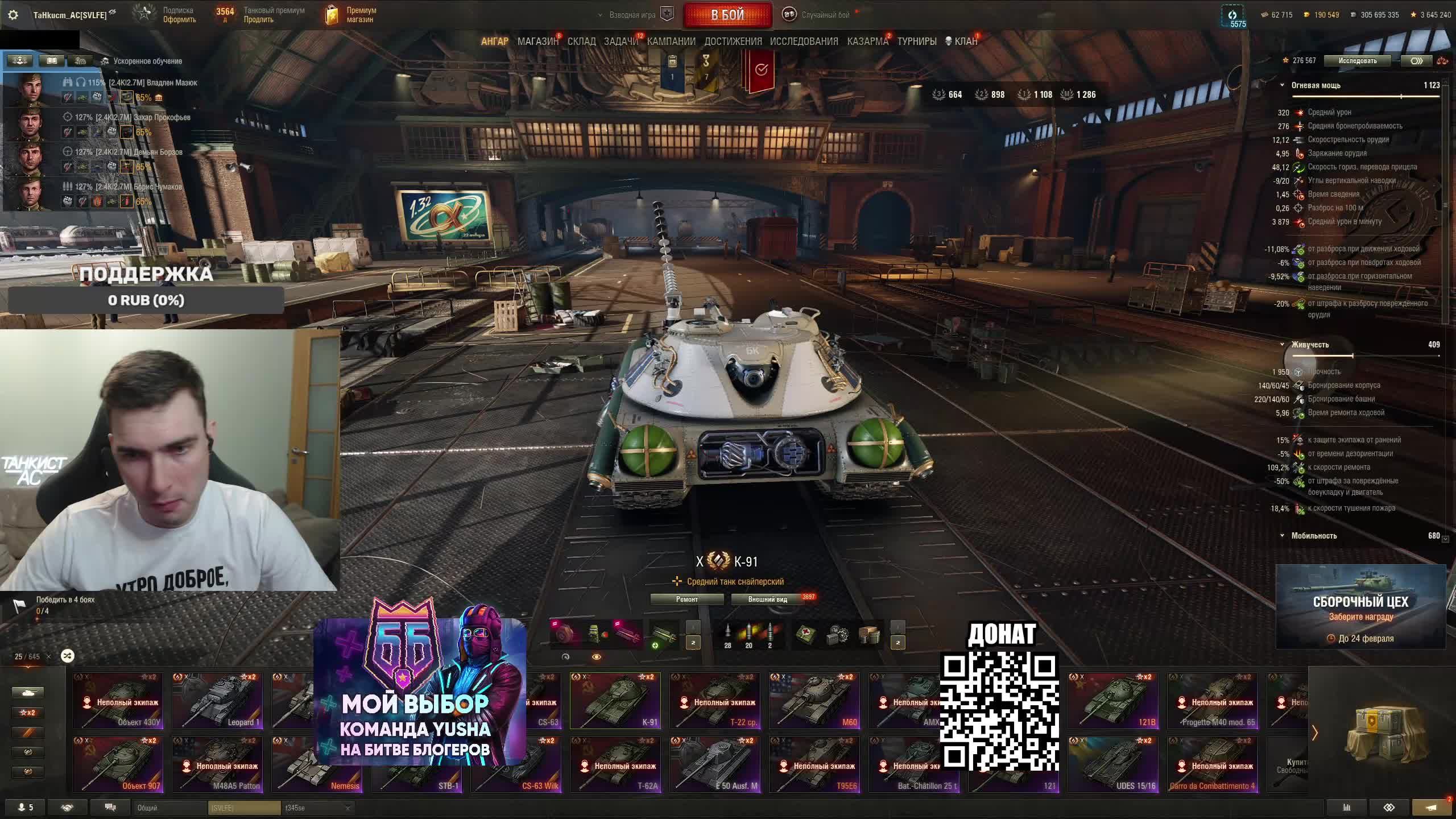Поддержать стримера http://www.donationalerts.ru/r/tahkucm_ac Сбер без комиссии 2202 2062 2408 9735 напишите в чате, чтобы проверил Telegram https://t.me/TaHkucm_AC Канал VK Play Live https://vkplay.live/tahkucm Канал Бусти https://boosty.to/tahkucm Канал на трово https://trovo.live/TaHkucm_AC Канал Яндекс Дзен https://dzen.ru/id/62355e95d406852937d33526 Группа Вконтакте https://vk.com/tahkucm_ac Оборудование и модернизации на все танки https://docs.google.com/spreadsheets/d/16koQOrtKQKQrAy2Pgfm6GBeG8bA1tJP_7Vm78knwUXA/edit#gid=422106233 Настройки игры в скринах https://dzen.ru/a/YmFvHhJ9yi3rZO5M Моды со скринами установки https://vk.com/topic-136212047_47639792 По поводу рекламы писать в личку https://vk.com/v_xarlamow Всем привет! Меня зовут Виктор, мой ник TaHkucm_AC. На моем канале стрим мира танков каждый день с 8 или 9 по мск. Так же иногда стримлю вечером в произвольное время, чтобы не пропустить подпишитесь на оповещения в телеге или вк (ссылки выше). Играю в танки с декабря 2011 года, а стримить начал в начале 2017 года. Во время стримов общаюсь с чатом, помогаю советами по игре, объясняю тактику. Средняя статистика 65% побед и 4-5к вн8. Фан кланы SLPFR - Командиры marmyn и artlay - из требований только то, чтобы вы часто играли в танки. Укреп 10 уровня. Участвуют в ивентах на ГК, как минимум чтобы собрать пропуск на аукцион. L-DS - Командир DarkSpawn13. Укреп 10 уровня, плюхи по кд SVLFE - Командир Shadowlions. Требуется Team Speak (программа связи) для взводов и клановых покатушек. Участвуют в ивентах на ГК, как минимум чтобы собрать пропуск на аукцион. укреп 10 уровня