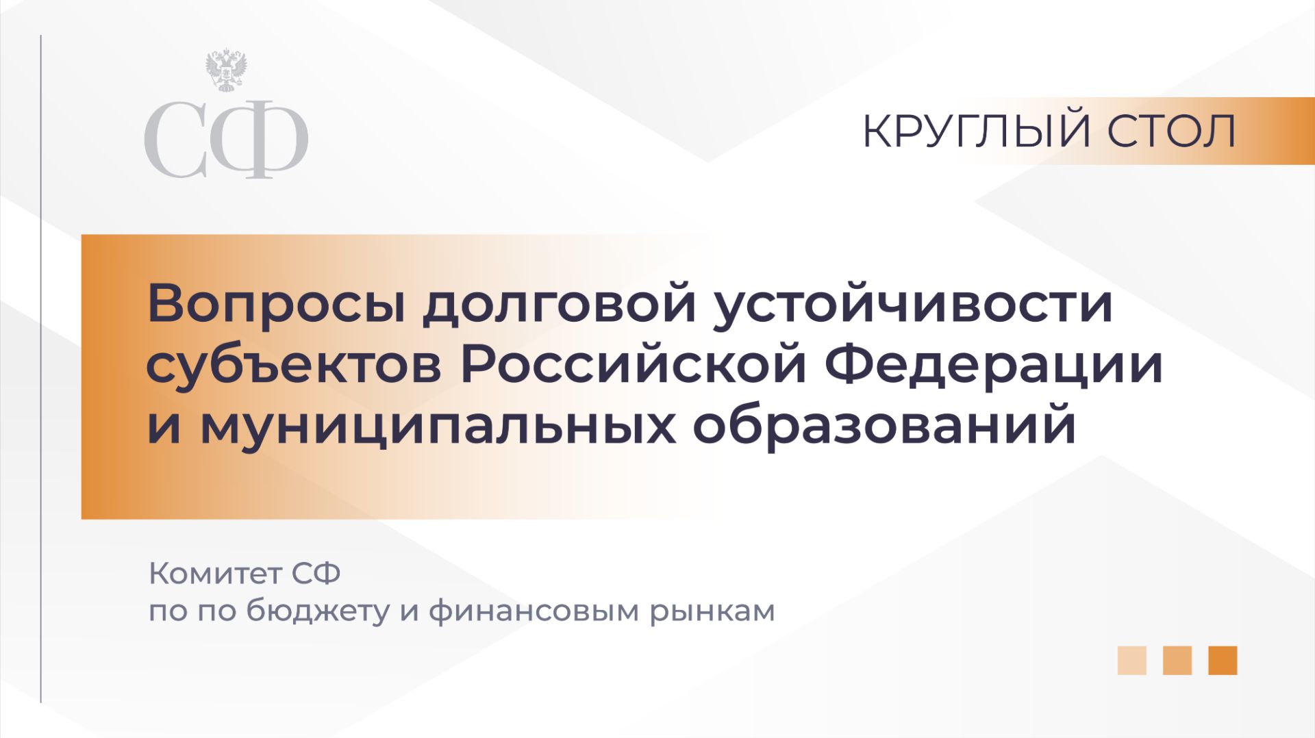 Председатель Комитета СФ по бюджету и финансовым рынкам Анатолий Артамонов проводит совещание на тему «Вопросы долговой устойчивости субъектов Российской Федерации и муниципальных образований». Участники рассмотрят вопросы специфики формирования и структуры государственного долга субъектов РФ и муниципального долга, возможностей для их уменьшения, а также предложения о мерах по повышению долговой устойчивости субъектов РФ в текущих экономических условиях и на перспективу. В мероприятии примут участие заместитель Министра финансов РФ Павел Кадочников, аудитор Счетной палаты Наталья Трунова, представители федеральных и региональных органов государственной власти, экспертного сообщества.
