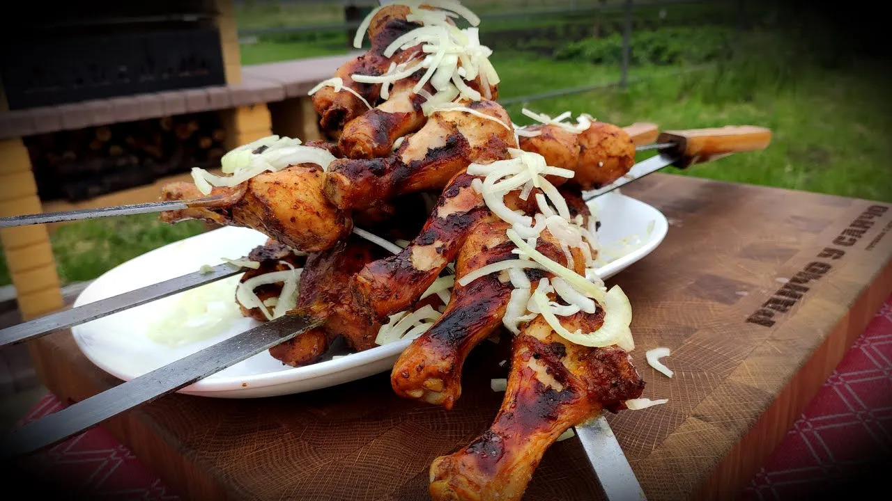 Шашлык из курицы на мангале. Вкусный сочный шашлык.