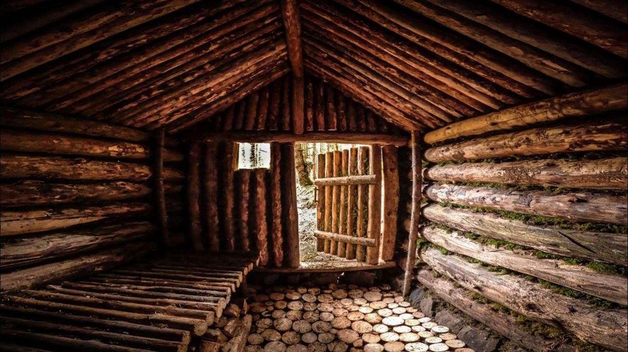 Строительство бревенчатой хижины в стиле бушкрафт для выживания / Поймал и приготовил/ От и до конца