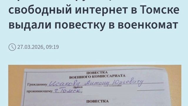 Поддержите нас донатом 5599 0020 9799 4521 Юмани карта Наш тг там больше видео https://t.me/reallyworldtoyou "Сибирский экспресс" пишет: "На томского общественника Антона Исакова, подавшего в мэрию заявки на акции против блокировок в интернете, написали два доноса в полицию. В них утверждалось, что он якобы призывает людей на "несогласованные акции". Об этом ему сказал участковый, который признался, что лично не смотрел канал Исакова в телеграме, потому что мессенджер заблокирован. Затем в отделении полиции военком вручил Исакову повестку для "уточнения данных". Активисту также дали предостережение "о недопустимости действий" по поводу несогласованных акций. Мэрия отказала ему в пикетах под предлогом того, что все 15 площадок, на которые поданы заявки, якобы уже заняты. Чиновники не предложили альтернативное место, хотя обязаны были сделать это по закону. Более того, администрация Томска утверждает, что "выражение мнения о блокировках информационных сервисов может расцениваться как публичное распространение под видом достоверных сообщений заведомо ложной информации" (статья 207.1 УК). Кто именно так подумал, чиновники не уточняют".