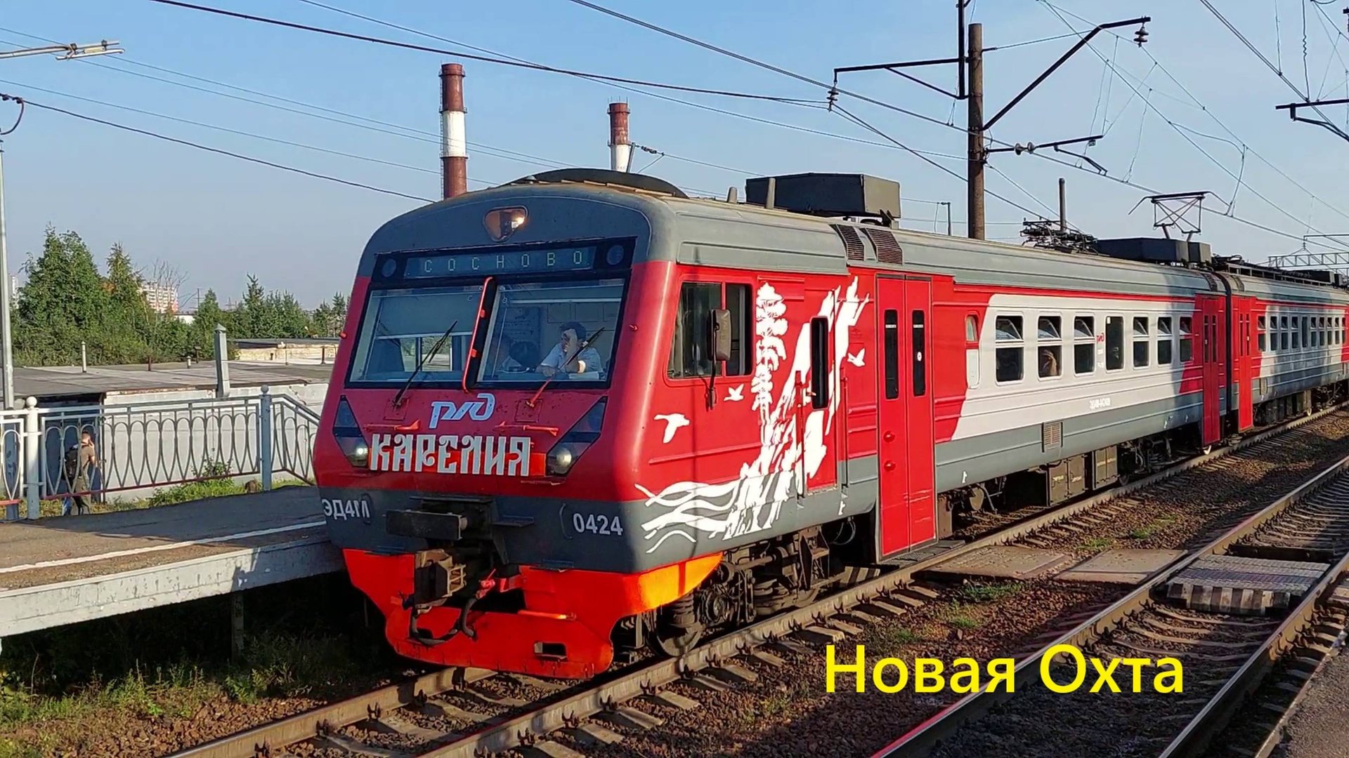 Электропоезд ЭД4М "Карелия" Петербург - Сосново прибывает на платформу "Новая Охта"