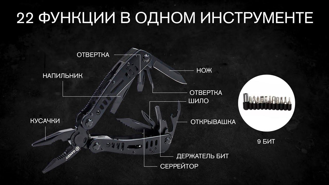 Мультитул Ganzo G103 вполне оправдывает звание «карманной мастерской». При весе 248 грамм и длине в сложенном виде всего 10,5 см, он обладает 22 различными функциями. Этот инструмент поможет вам устранить неисправности велосипеда, туристического снаряжения, экипировки охотника или рыбака. Да и в домашнем быту он пригодится не единожды. Одно из основных преимуществ такого мультитула — наличие полноценных плоскогубцев с мощными подпружиненными губками, встроенными кусачками для проволоки и ребристым захватом для предметов круглой формы. Помимо того, в пустых изнутри рукоятках мультитула размещаются открывалка для бутылок, две плоские и крестовидная отвертки, шило (его же можно использовать в качестве маленького ножа), линейка, на обратной стороне которой — напильник, два клинка (гладкий и с серрейторной заточкой). Также имеется держатель для бит с квадратным сечением. Сами же биты прилагаются в отдельном органайзере: 8 сменных насадок и переходник. Хотя мультитул и сделан из нержавеющей стали, на инструменты нанесено стойкое черное покрытие, которое играет роль дополнительного барьера для коррозии. К тому же, благодаря этому покрытию, мультитул — матовый и выглядит очень стильно. Для хранения мультитула вместе с битами, предусмотрен тканевый чехол. Особенности: полноразмерная конструкция плоскогубцы со встроенными кусачками 22 функции удобный чехол на липучке комплект из восьми сменных бит мультитул весит 248 грамм размер сложенного инструмента — 10,5 см. Гарантия: Мультитулы Ganzo G103 продаются с гарантией производителей сроком на один год. Подробные характеристики и актуальную цену можно найти на нашем сайте ► https://avantmarket.ru/multitul-ganzo-g103/ Если у вас возникнут какие-либо вопросы или потребуется дополнительная помощь, пожалуйста, не стесняйтесь обращаться к нам. Мы всегда готовы помочь вам и сделать ваш опыт взаимодействия с нами еще более приятным. Наши контакты: https://avantmarket.ru/ Общие вопросы: info@avantmarket.ru По вопросам продаж: sales@avantmarket.ru Номера для связи: +7 (499) 553 04 15 +7 (931) 009 32 83
