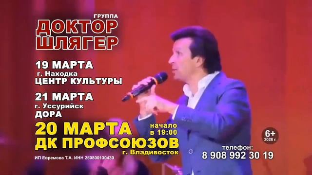20 марта на сцене ДК Профсоюзов с концертом выступит группа «Доктор Шлягер»! Купить билеты онлайн можно на VL.ru https://www.vl.ru/afisha/vladivostok/event/242275 19 марта концерт пройдет в Находке https://www.vl.ru/afisha/vladivostok/event/242278 21 марта в Уссурийске https://www.vl.ru/afisha/vladivostok/event/242282 Концерт, посвящённый 80-летию со дня рождения композитора Вячеслава Добрынина - легендарного советского и российского композитора и певца, лауреата всесоюзных и международных конкурсов и фестивалей, народного артиста РФ. Песни всенародно любимого композитора, человека потрясающей творческой энергии и таланта – Вячеслава Добрынина знает и поёт вся Россия. Им были написаны свыше тысячи песен в соавторстве с известными поэтами нашей страны. Практически все они стали хитами. Счастливую судьбу этих песен предопределили замечательная музыка, хорошие стихи и великолепное исполнение популярных артистов советской и российской эстрады. Творчество Вячеслава Добрынина стало культурным достоянием нашей страны. Композитор внёс существенный вклад в развитие советской и российской эстрады. На песнях Добрынина выросло не одно поколение, и до сих пор их слушают и поют миллионы людей во всём мире: «Родная земля», «Прощай», «Льётся музыка», «Синий туман», «Не сыпь мне соль на рану», «Все, что в жизни есть у меня», «На теплоходе музыка играет», «Старый альбом», «Ах, какая женщина!», «Где же ты была?», «Колдовское озеро», «Большая медведица», «Кто тебе сказал?», «Вот увидишь», «Так вот какая ты», «За милых дам», «Живи, родник, живи»... Группа «Доктор Шлягер» была создана в 1990 году известным композитором и певцом Вячеславом Добрыниным. Идея создания коллектива возникла из желания Маэстро иметь постоянную аккомпанирующую группу, которая могла бы профессионально исполнять его многочисленные произведения во время концертных туров. Вячеслав Добрынин, будучи автором более чем тысячи песен, многие из которых стали поистине народными хитами, нуждался в надежных музыкантах и вокалистах, которым он мог бы доверить свое творческое наследие. В состав группы вошли исполнители, которые долгое время работали вместе с Вячеславом Добрыниным, зарекомендовав себя как профессионалы и надежные коллеги. Основой и, как часто упоминается в источниках, «золотым составом» группы стали: Алексей Зардинов — Заслуженный артист России, певец, телеведущий и композитор. Он является одним из ключевых вокалистов коллектива. Юрий Самохвалов — еще один важный вокалист, присоединившийся к коллективу в начале 1990-х годов. Эти музыканты не просто исполняют песни, они являются преемниками творческой манеры Маэстро, с которыми его связывали не только рабочие, но и человеческие отношения. Репертуар группы «Доктор Шлягер» состоит исключительно из хитов Вячеслава Добрынина, таких как «Синий туман», «Не сыпь мне соль на рану», «Все, что в жизни есть у меня», «Льется музыка», «Ах, какая женщина!» и многих других. Практически все композиции посвящены вечным темам: женщинам, любви и красоте. Группа «Доктор Шлягер» — это не просто музыкальный коллектив, а живое продолжение богатого творческого наследия Вячеслава Добрынина, исполняющее его бессмертные хиты и поддерживающее связь поколений через музыку, которая не стареет. Они продолжают радовать зрителей своими выступлениями по всей России. Продолжительность: 2 часа.