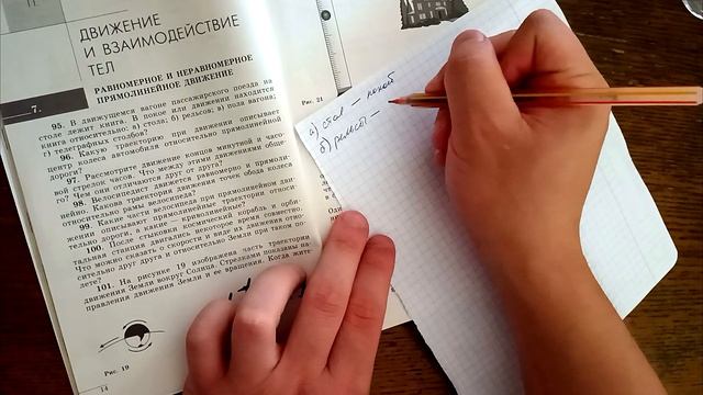 Подробное решение номер № 95 по физике сборник задач для учащихся 7‐9 класса , авторов Лукашик, Иванова 2016 Условие задачи: 95. В движущемся вагоне пассажирского поезда на столе лежит книга. В покое или движении находится книга относительно: а) стола; б) рельсов; в) пола вагона; г) телеграфных столбов?