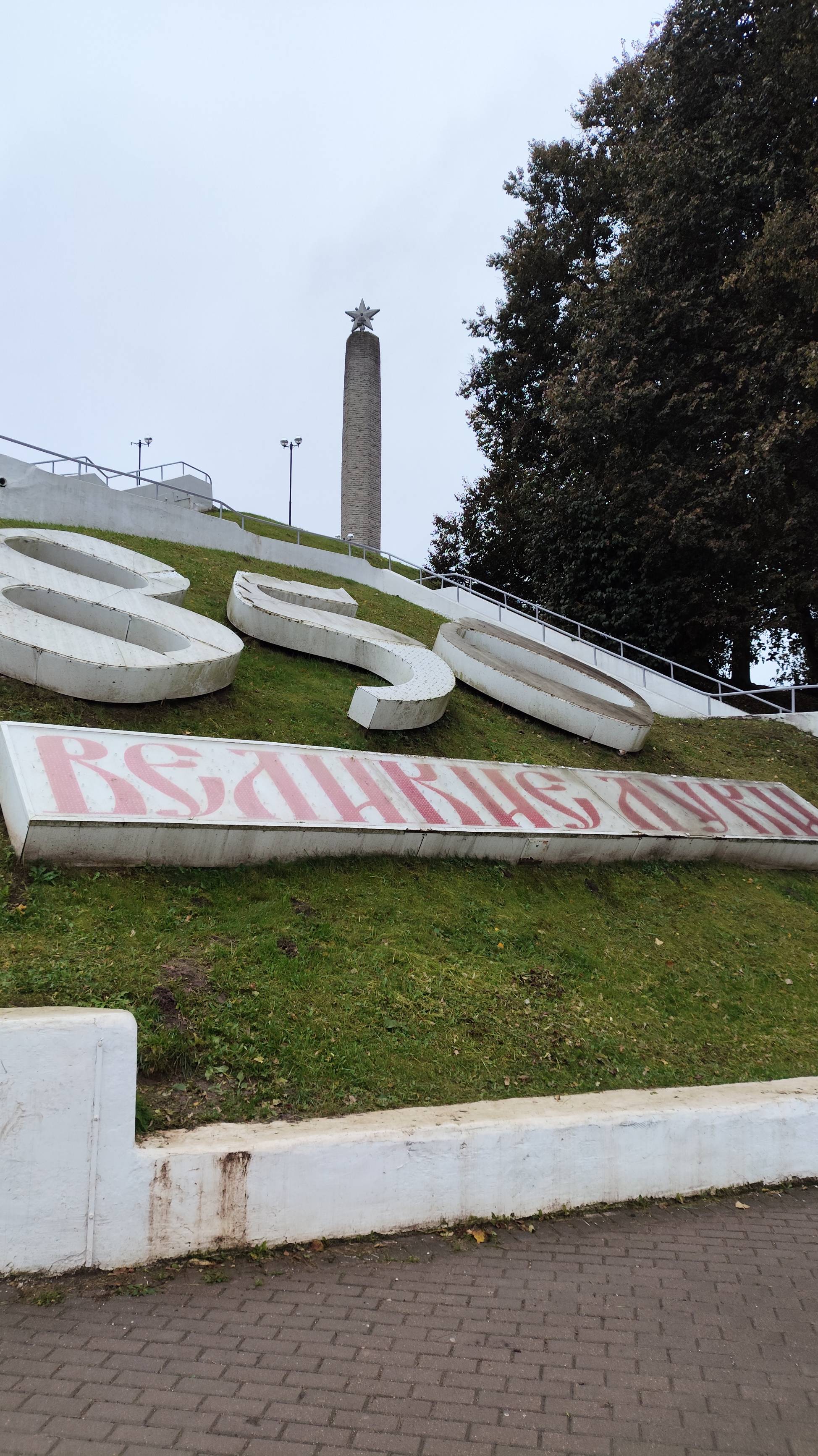 Земляной вал крепости устроенная по указанию Петра I. Обелиск Славы (1960). Великие Луки. Псковская область .