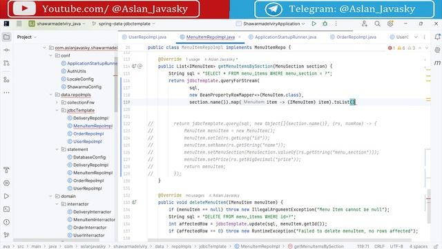 Задонатить: https://yoomoney.ru/to/4100110584940159 Курс по Spring framework на языках Java/Kotlin на примере разработки клиент-серверного приложения для заказа шаурмы) Исходный код ко всем урокам по модулю "JDBC Template" (JdbcTemplate/NamedParameterJdbcTemplate): https://github.com/AslanJavasky/shawarmadelivery_java/tree/spring-data-jdbctemplate https://github.com/AslanJavasky/shawarmadelivery_kotlin/tree/spring-data-jdbctemplate Задонатить преподавателю: Карта Сбер: 5469 6000 2144 3601 (Аслан) Карта Т-Банк: 2200 7001 1633 9259 (Аслан) Карта Альфа-Банк: 2200 1523 1074 7517 (Аслан) ЮMoney(ЯндексДеньги): 4100110584940159 для донатов из-за рубежа: https://www.donationalerts.com/r/aslan_javasky Спасибо :) Без VPN: https://vkvideo.ru/playlist/-229755761_3