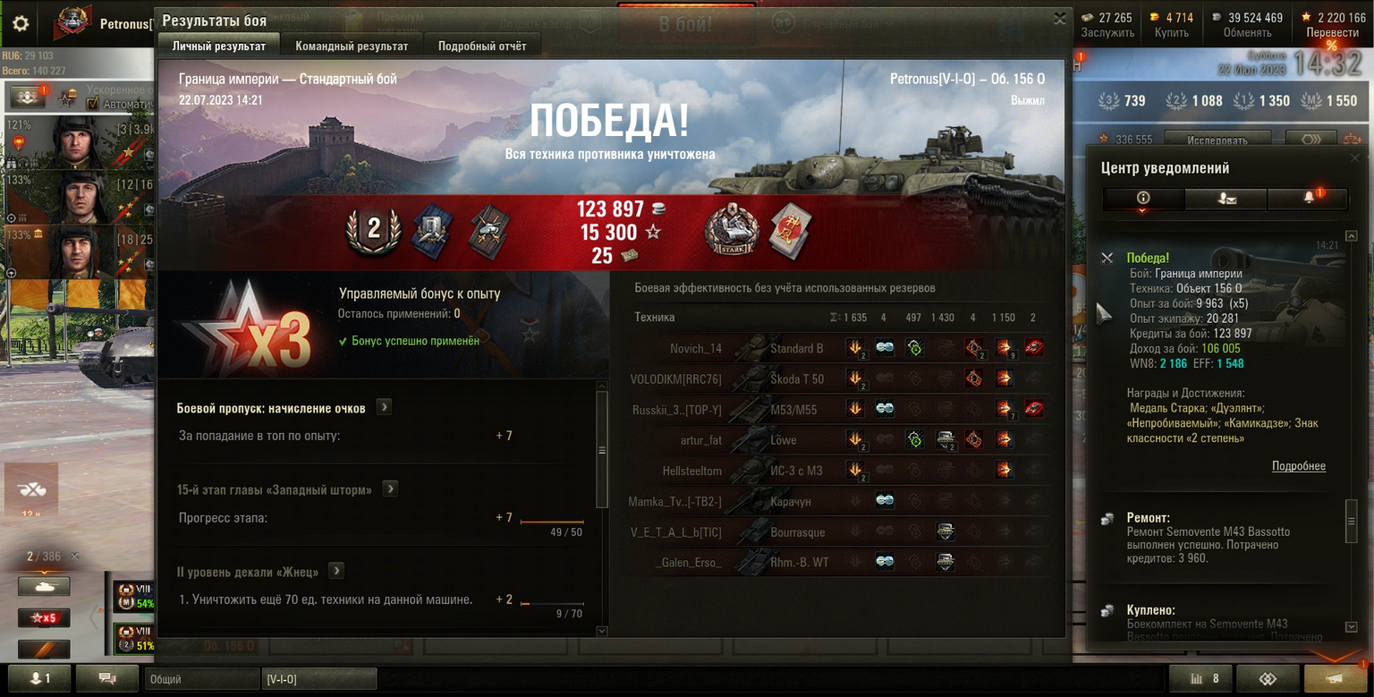 Победа! Бой: Граница империи, Техника: Камикадзе на Горыныче Объект 156 О, Граница империи, 4000суммарки, 2фраг Опыт за бой: 9 963 (x5) , Опыт экипажу: 20 281, Кредиты за бой: 123 897, Доход за бой: 106 005, WN8: 2 186, EFF: 1 548, Награды и Достижения: Медаль Старка; «Дуэлянт»; «Непробиваемый»; «Камикадзе»; Знак классности «2 степень»