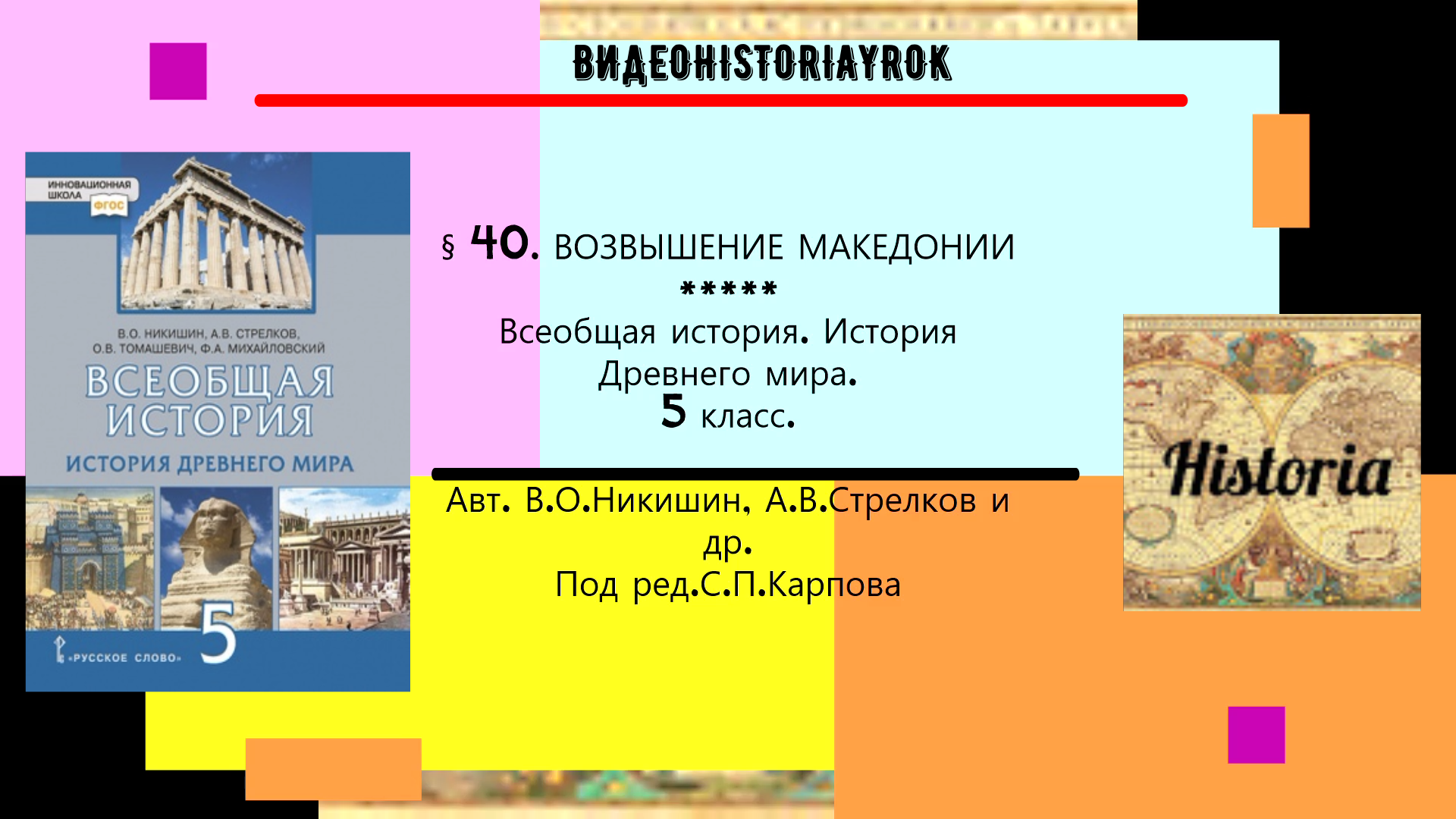 В образно-иллюстративной форме в пределах § 40. "Возвышение Македонии". Учебника Всеобщая история. История Древнего мира. Авт. В.О.Никишин,А.В.Стрелков, О.В.Томашевич, Ф.А.Михайловский. Под ред.С.П.Карпова. ( Последнее издание). "Русское слово" -Инновационная школа: рассказывается по плану: 00:23- Введение 00:51 - Пункт 1. Македония и ее усиление при царе Филиппе II. 03:20- Пункт 2. Демосфен-оратор и патриот. 04:07 - Пункт 3.Битва при Херонее и Коринфский съезд. 05:13 - Пункт 4. Гибель Филиппа II и приход к власти Александра. Видео будет отличным подспорьем на уроке или для самостоятельного изучения материала, а также закрепления уже изученного материала
