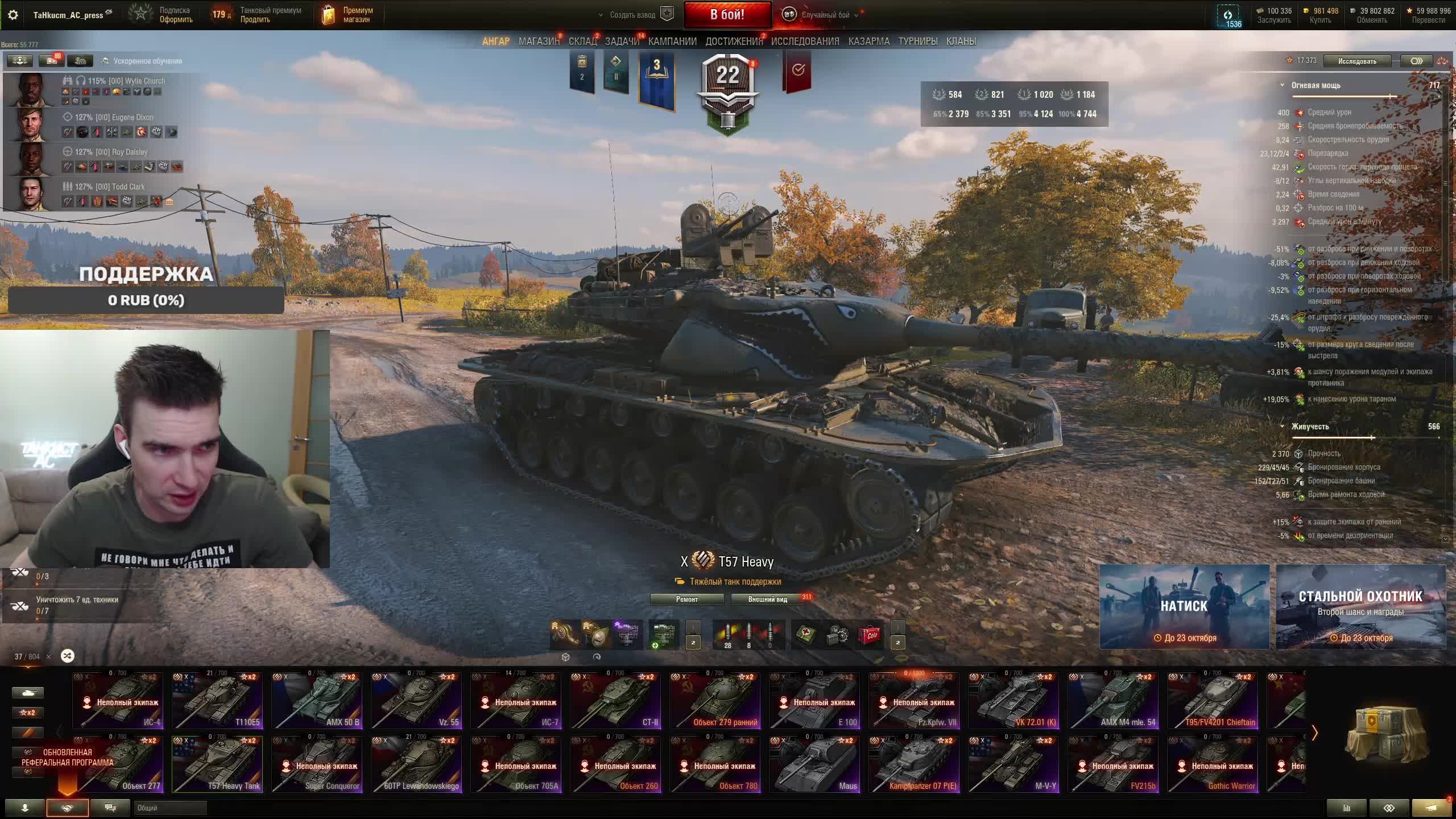 Донат http://www.donationalerts.ru/r/tahkucm_ac Сбер 2202 2062 2408 9735 напишите в чате, чтобы проверил Заказы буду катать из чата, если не будет заказов за донат Заказ за донат от 200 рублей 500 рублей приоритетная очередь и возможность заказать фул ББ 1000 рублей элита еще больше приоритета и возможность заказать фул фугасы 1500 рублей целый стрим по вашему танку примерно 3 часа, танки от 6 уровня, кроме арты. Telegram https://t.me/TaHkucm_AC Канал VK Play Live https://vkplay.live/tahkucm Канал Бусти https://boosty.to/tahkucm Канал на трово https://trovo.live/TaHkucm_AC Канал Дзен https://dzen.ru/id/62355e95d406852937d33526 Группа Вконтакте https://vk.com/tahkucm_ac Оборудование и модернизации на все танки https://docs.google.com/spreadsheets/d/16koQOrtKQKQrAy2Pgfm6GBeG8bA1tJP_7Vm78knwUXA/edit#gid=422106233 Настройки игры в скринах https://dzen.ru/a/YmFvHhJ9yi3rZO5M Моды со скринами установки https://vk.com/topic-136212047_47639792 По поводу рекламы писать в личку https://vk.com/v_xarlamow Всем привет! Меня зовут Виктор, мой ник TaHkucm_AC. На моем канале стрим мира танков каждый день с 9 до 12 мск. Так же иногда стримлю вечером в произвольное время, чтобы не пропустить подпишитесь на оповещения в телеге или вк (ссылки выше). Играю в танки с декабря 2011 года, а стримить начал в начале 2017 года. Во время стримов общаюсь с чатом, помогаю советами по игре, объясняю тактику. Средняя статистика 65% побед и 4-5к вн8. Фан кланы SLPFR - Командиры marmyn и artlay - из требований только то, чтобы вы часто играли в танки. Укреп 10 уровня. Участвуют в ивентах на ГК, как минимум чтобы собрать пропуск на аукцион. L-DS - Командир DarkSpawn13. Укреп 10 уровня, плюхи по кд SVLFE - Командир Shadowlions. Требуется Team Speak (программа связи) для взводов и клановых покатушек. Участвуют в ивентах на ГК, как минимум чтобы собрать пропуск на аукцион. укреп 10 уровня