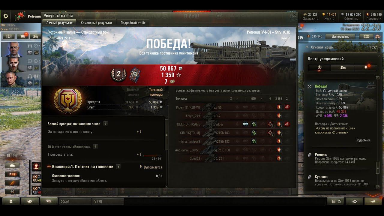 Победа! Бой: Устричный залив, Техника: Strv 103B, Устричный залив, 3868 урон, 2 фраг Опыт за бой: 1 359 , Опыт экипажу: 1 359, Кредиты за бой: 50 867, Доход за бой: -45 373, WN8: 4 085, EFF: 2 036, Награды и Достижения: «Огонь на поражение»; Знак классности «2 степень» ----------- Здесь мои покатушки по игре МИР ТАНКОВ. Не судите строго, играю урывками после работы. :). https://rutube.ru/channel/23544308 Всем добра :) и удачи на полях сражений! :) --------------------- http://wotreplays.ru/uploader/anpetr33/id/414778 --------------------- --------------------- Мой канал на РУТУБе ★ https://rutube.ru/channel/23544308 --------------------- Мой канал на твитче ★ https://www.twitch.tv/anpetr33 --------------------- Мой канал на ЮТУБе ★ https://www.youtube.com/channel/UCPZbvH8TEAkNYXJClIHbgZQ --------------------- Поддержать стримера ★ http://bit.ly/2g49x6x