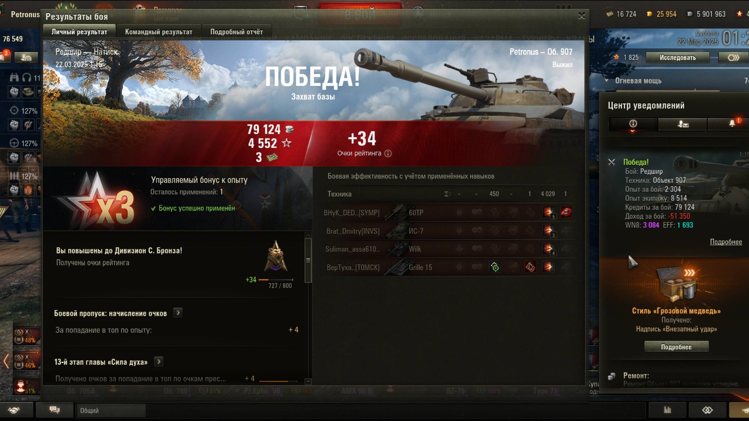 2025.03.22 Натиск, Объект 907, Редшир, 4029 урон, 1 фраг