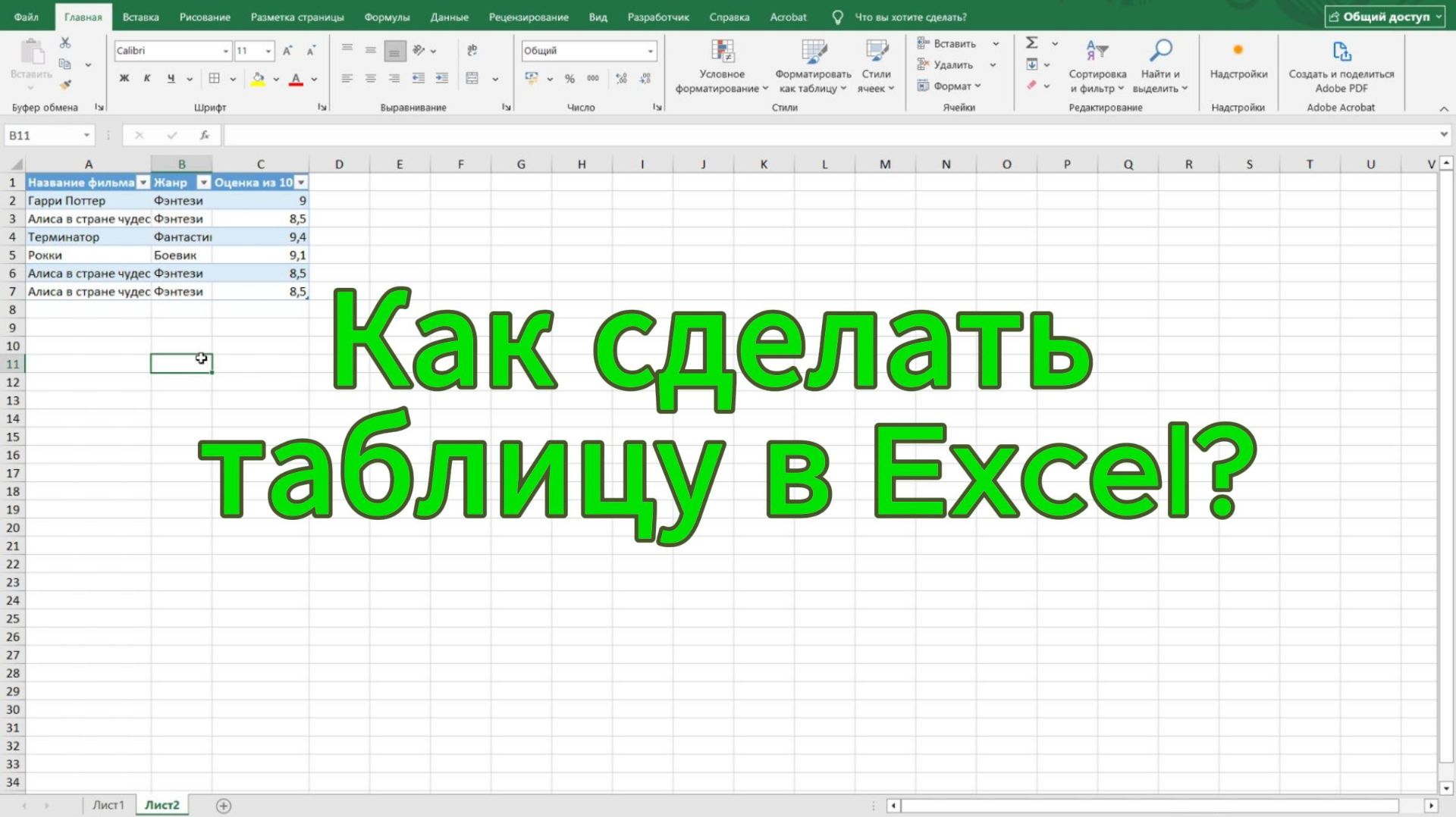 Привет! Сегодня мы научимся создавать таблицы в Excel (экселе) — это очень полезная программа для работы с данными. Представь, что это большая тетрадка в клеточку, где можно записывать числа, слова и даже считать что-то автоматически. Разберём три способа создания таблиц — от самого простого к чуть более сложному. Способы создания таблиц. В Excel (эксель) есть три основных способа создать таблицу: Ручное создание — ты просто заполняешь ячейки данными, как в тетрадке. Самый простой способ, если нужно быстро записать что-то без особых «наворотов». Вставка таблицы — Excel сам сделает красивую таблицу с фильтрами и автоматическим расширением. Подходит, когда хочешь, чтобы всё было аккуратно и функционально. Использование шаблонов — выбираешь готовую заготовку (например, для списка покупок или расписания), и остаётся только вписать свои данные. Идеально, если не хочется придумывать структуру с нуля. Рассмотрим каждый метод на примере. Первый способ - ручное создание таблицы. Этот способ подойдёт, если ты хочешь быстро набросать таблицу без лишних действий. Например, составим список любимых фильмов с оценками. Открой Excel. Перед тобой появится пустой лист с ячейками. Введи заголовки столбцов в первую строку: в ячейку A1 напиши «Название фильма»; в ячейку B1 — «Жанр»; в ячейку C1 — «Оценка из десяти)». Заполни данные построчно: в A2 — «Гарри Поттер»; в B2 — «Фэнтези»; в C2 — 9. Продолжи для других фильмов. Оформи таблицу, чтобы она выглядела аккуратнее: выдели первую строку (заголовки), нажми кнопку «Жирный» (B) на вкладке «Главная»; выдели все заполненные ячейки, на вкладке «Главная» найди кнопку с изображением сетки («Границы») и выбери «Все границы». Подгони ширину столбцов: наведи курсор на границу между заголовками столбцов (например, между A и B), когда курсор станет двусторонней стрелкой, дважды щёлкни — столбец автоматически подстроится под содержимое. Плюсы: быстро, просто, не требует специальных навыков. Минусы: нет фильтров, таблица не расширяется автоматически. Второй способ - вставка таблицы. Используй этот способ, если хочешь, чтобы таблица была «умной»: с фильтрами для сортировки и возможностью легко добавлять новые строки. Сначала заполни данные вручную (как в первом способе), но пока без границ и форматирования. Выдели все заполненные ячейки (включая заголовки). Перейди на вкладку «Вставка» в верхней части экрана. Нажми кнопку «Таблица». В появившемся окне убедись, что диапазон ячеек указан правильно, и поставь галочку «Таблица с заголовками» (если у тебя есть заголовки в первой строке). Нажми «ОК». Что произойдёт? ячейки окрасятся в полосатый узор; в заголовках появятся маленькие стрелочки — это фильтры. Нажав на них, можно отсортировать данные или скрыть какие-то строки; если добавить данные в столбец ниже таблицы, она автоматически расширится. Горячие клавиши для ускорения: вместо пунктов 3–6 просто нажми Contrl + T (на клавиатуре), когда ячейки выделены. Плюсы: фильтры, автоматическое расширение, красивое оформление. Минусы: чуть больше шагов, чем при ручном способе. Третий способ - использование шаблонов. Если тебе нужна таблица для какой-то конкретной цели (список покупок, расписание уроков, бюджет на месяц), Excel может предложить готовый вариант. Шаги: При открытии Excel (или через меню «Файл» - «Создать») ты увидишь раздел «Шаблоны». Пролистай 