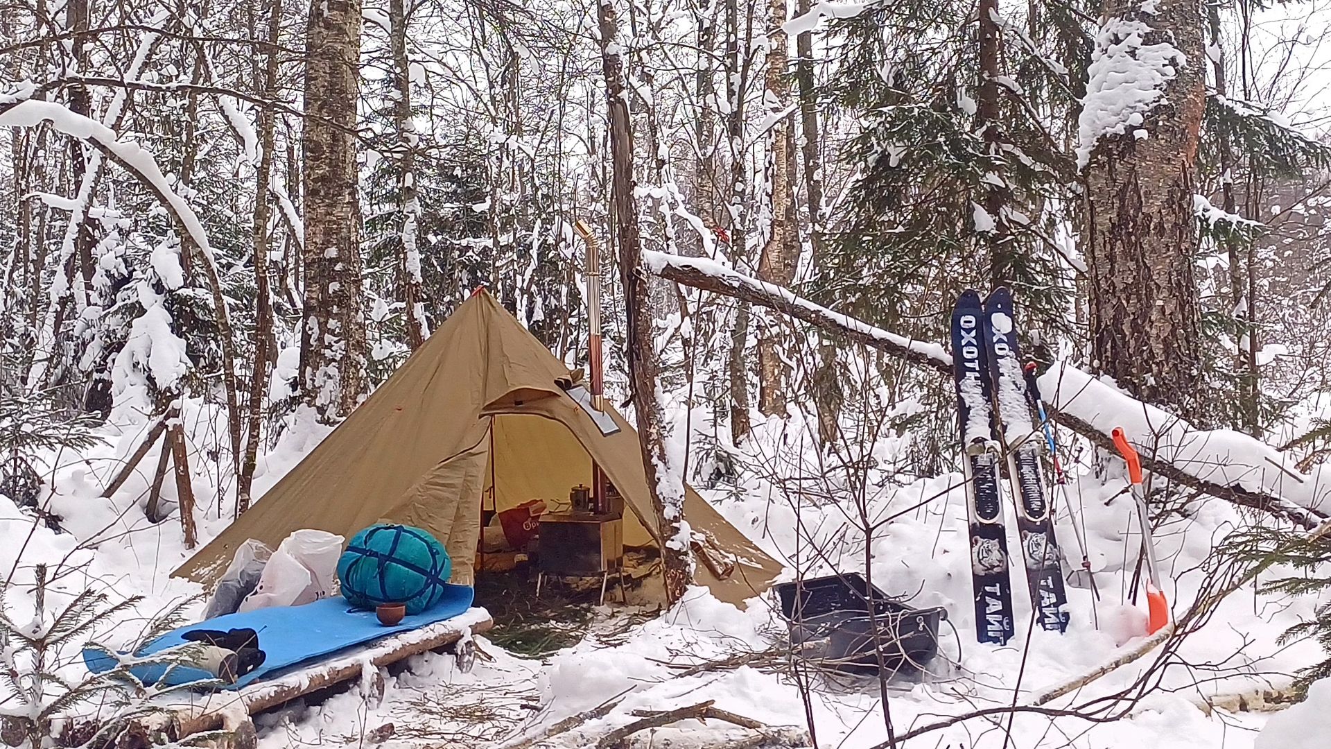 Поход выходного дня в зимний лес. Смоленская область. Ночевка в палатке (типи) с печкой. Готовлю на печи мясо и овощи. Походный быт. Передаю привет подписчику. Бушкрафт. Новая раскладная кровать для зимних ночевок. ** Это видео в разрешении HD 50fps *** Ютуб версия в полном FHD разрешении: https://youtu.be/VS0O5qsNGuY