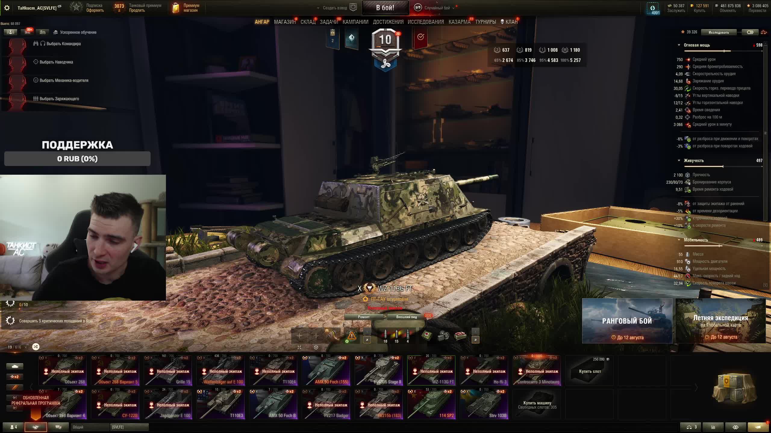 Поддержать стримера http://www.donationalerts.ru/r/tahkucm_ac Сбер без комиссии 2202 2062 2408 9735 напишите в чате, чтобы проверил Telegram https://t.me/TaHkucm_AC Канал Рутуб https://rutube.ru/channel/38980155/ Канал VK Play Live https://vkplay.live/tahkucm Канал Бусти https://boosty.to/tahkucm Канал на трово https://trovo.live/TaHkucm_AC Канал Дзен https://dzen.ru/id/62355e95d406852937d33526 Группа Вконтакте https://vk.com/tahkucm_ac Оборудование и модернизации на все танки https://docs.google.com/spreadsheets/d/16koQOrtKQKQrAy2Pgfm6GBeG8bA1tJP_7Vm78knwUXA/edit#gid=422106233 Настройки игры в скринах https://dzen.ru/a/YmFvHhJ9yi3rZO5M Моды со скринами установки https://vk.com/topic-136212047_47639792 По поводу рекламы писать в личку https://vk.com/v_xarlamow Всем привет! Меня зовут Виктор, мой ник TaHkucm_AC. На моем канале стрим мира танков каждый день с 8 или 9 по мск. Так же иногда стримлю вечером в произвольное время, чтобы не пропустить подпишитесь на оповещения в телеге или вк (ссылки выше). Играю в танки с декабря 2011 года, а стримить начал в начале 2017 года. Во время стримов общаюсь с чатом, помогаю советами по игре, объясняю тактику. Средняя статистика 65% побед и 4-5к вн8. Фан кланы SLPFR - Командиры marmyn и artlay - из требований только то, чтобы вы часто играли в танки. Укреп 10 уровня. Участвуют в ивентах на ГК, как минимум чтобы собрать пропуск на аукцион. L-DS - Командир DarkSpawn13. Укреп 10 уровня, плюхи по кд SVLFE - Командир Shadowlions. Требуется Team Speak (программа связи) для взводов и клановых покатушек. Участвуют в ивентах на ГК, как минимум чтобы собрать пропуск на аукцион. укреп 10 уровня