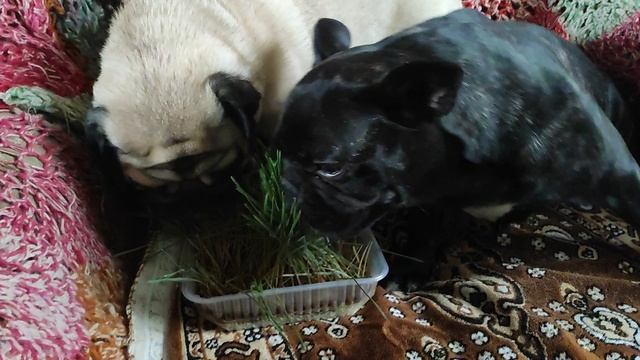 Малая (мопс) и Чуча (темно-тигровая француженка) пробуют рожь