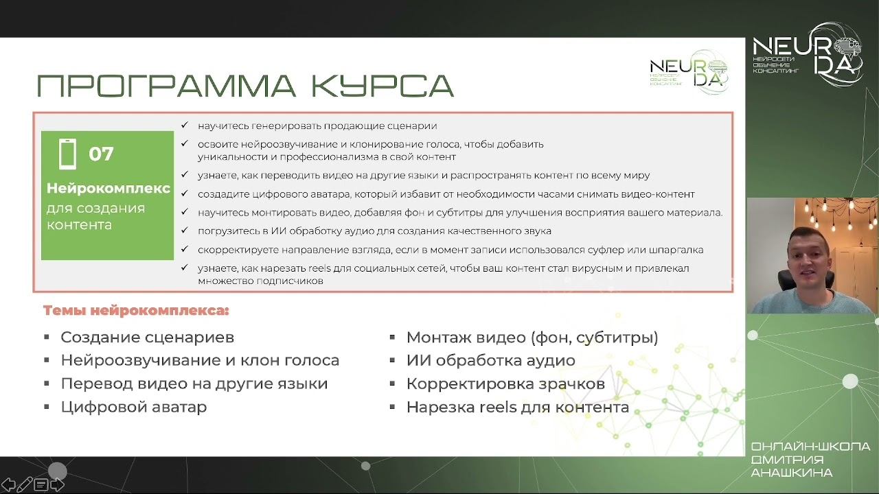 https://neuroda.ru/special-web#6 Модули курса по нейросетям: Подробное руководство Почему стоит выбрать этот курс? Практическая направленность: Каждый модуль ориентирован на немедленное применение знаний в реальной жизни, будь то автоматизация бизнес-процессов или создание контента. Индивидуальная поддержка: Для участников тарифа "Нейро Гуру" предусмотрено VIP сопровождение, которое включает консультации и персональную помощь. Гибкость обучения: Все модули доступны в записи, что позволяет проходить курс в удобное для вас время и темпе.