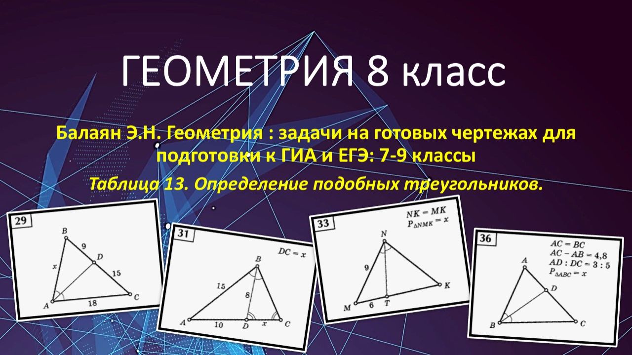 https://dzen.ru/profile/editor/irinaklok https://vkvideo.ru/@club228129393 Геометрия 8 класс по учебнику Атанасяна. В этом видео решаем задачи из сборника Балаяна Э.Н. Геометрия: задачи на готовых чертежах для подготовки к ГИА и ЕГЭ: 7-9 классы. Таблица 13. Определение подобных треугольников. Найдите х, y, z. 00:00:00 Задача 29 00:05:41 Задача 31 00:12:02 Задача 33 00:21:17 Задача 36