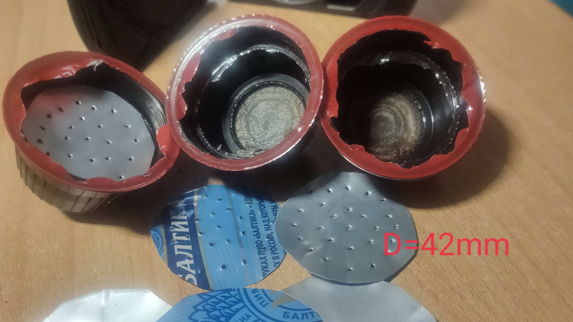 Капсулы для кофемашин одноразовые. Корпус капсулы достаточно прочный, поэтому может быть использован ещё раз. для приготовления порции кофе. Изготавливаем две крышки 42 и 52 мм в диаметре. В крышке 42 мм делаются перфорационные отверстия. В видео всё это показано.