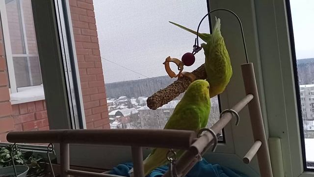 попугаи акробаты едят вкусняшку