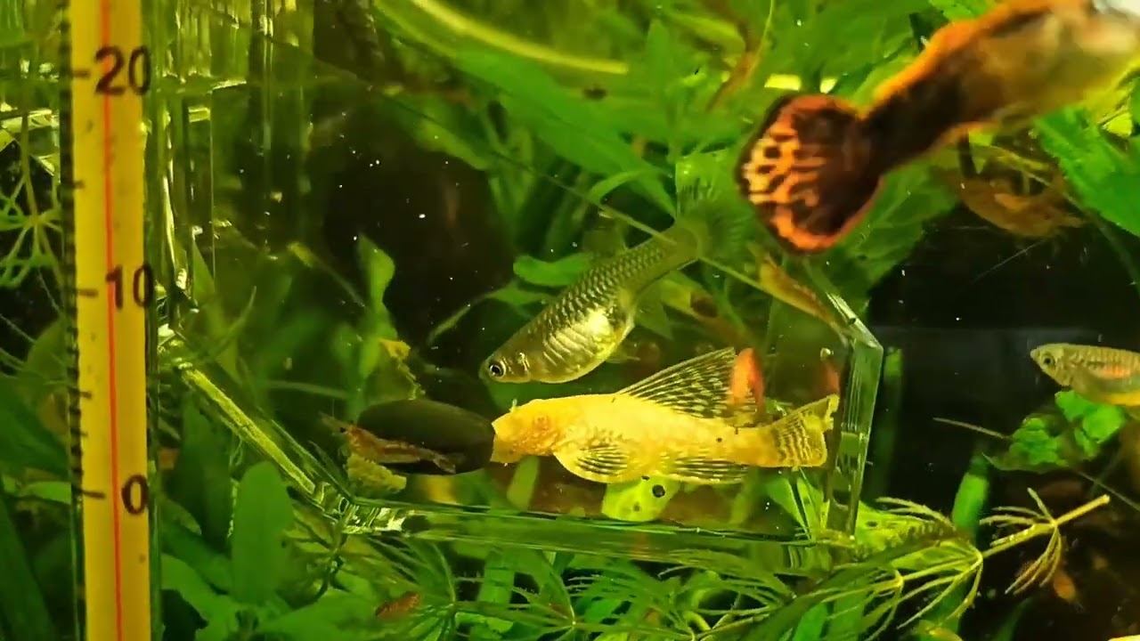 Аквариум с гуппи и креветками до прополки. Aquarium with guppies and shrimp before weeding