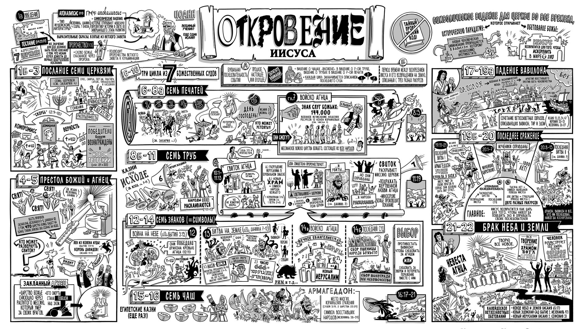 Посмотрите наш видеообзор книги Откровение, главы 12-22, в котором мы рассматриваем её литературную композицию и ход мыслей автора. В Откровении видения Иоанна показывают, что Иисус победил зло Своей смертью и воскресением и однажды вернется как истинный Царь мира.