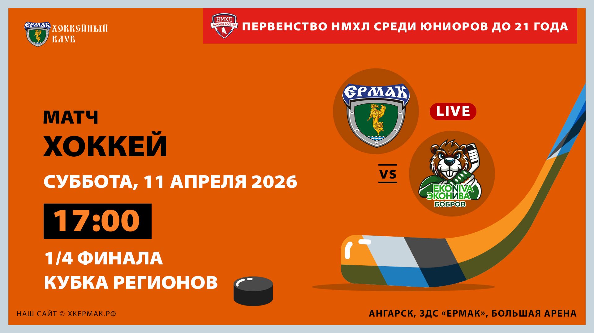 Матч между командами «Ермак» (Ангарск, Иркутская бласть) и «ЭкоНива-Бобров» (Бобров, Воронежская область) в рамках Первенства Национальной молодёжной лиги среди юниоров до 21 года. Конференция «Восток». Второй этап. Сезон 2025/26 годов. 11 апреля 2026 года. Первый матч серии 1/4 финала Кубка регионов. г. Ангарск, ДС «Ермак», большая арена Начало в 17-00 (по ирк. времени)