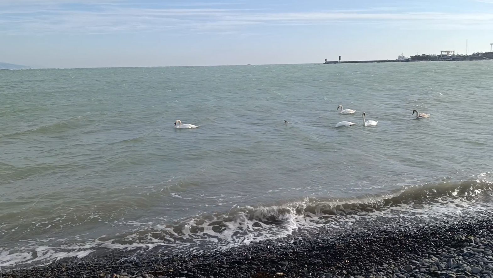 Лебеди на пляже Алексино в Новороссийске 21 февраля 2026 года