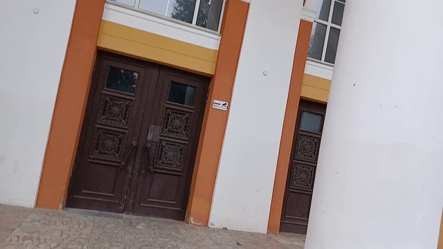 Огромные колонны и лепнина на фасаде ДК Сталинской застройки в Электростали