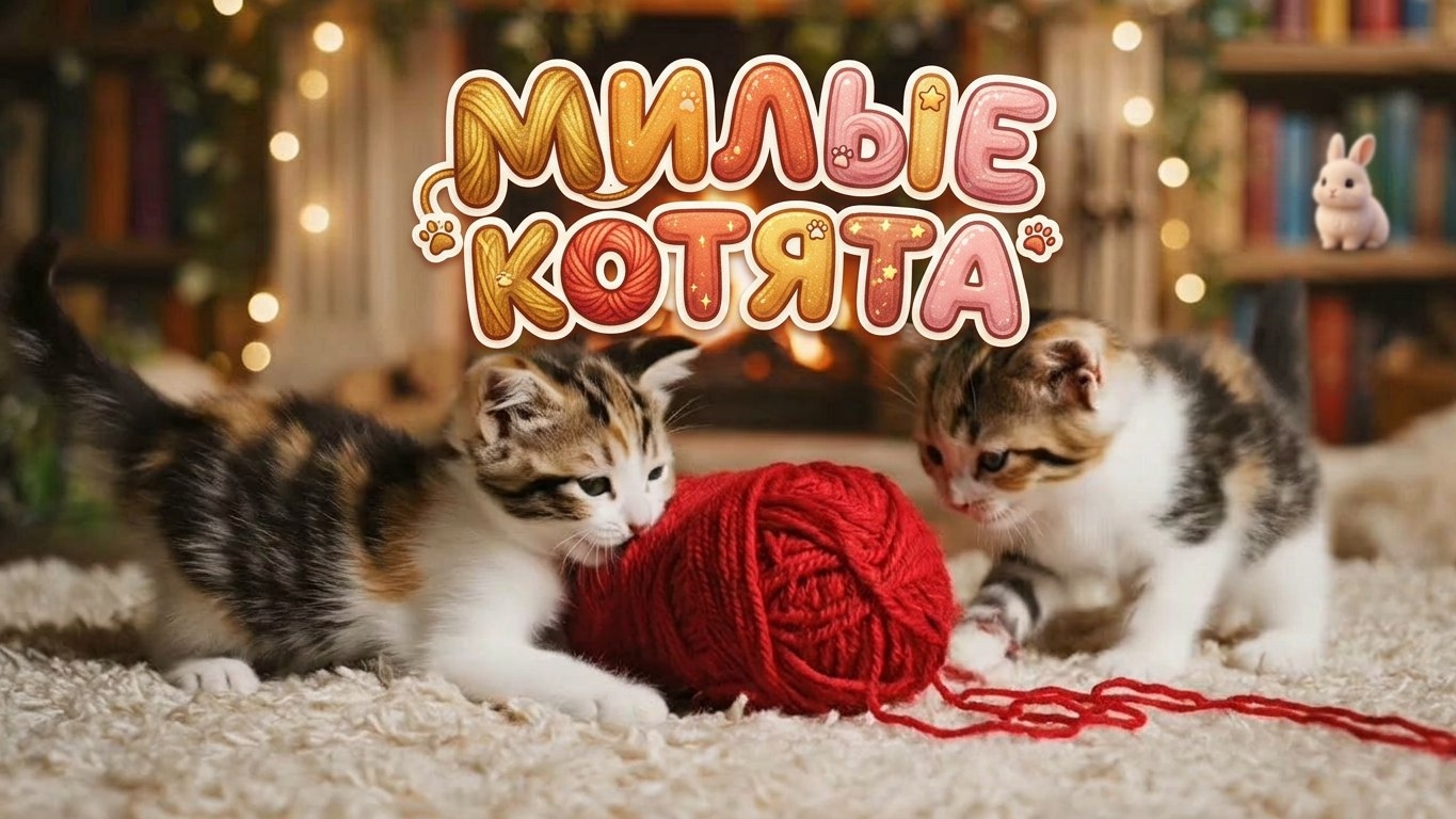 Маленькие котята играют у камина с клубком ниток