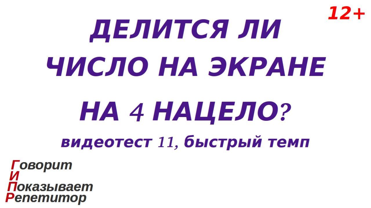 Категория 12+. Этот видеоролик - основа эпизода игры в репетитора и ученика и позволяет тренироваться применять признак делимости на 4 нацело (без остатка). Правила игры в этом эпизоде такие: после запуска видео репетитор-компьютер (планшет, смартфон, телевизор) показывает (отображает) на экране число, а вопрос репетитора следующий: "Делится ли изображенное число на 4 нацело?". Игрок-ученик должен дать ответ (вслух или про себя). Через некоторое время на экране появляется правильный ответ, с которым нужно сравнить свой собственный. Затем показывается следующее число и т. д. Цель игрока-ученика - дать как можно больше правильных ответов. Если все ответы верные, это считается абсолютной победой ученика в этом эпизоде игры. Я рекомендую это видео в первую очередь детям, осваивающим тему "Признаки делимости нацело". Таким образом, ролик представляет собой игровой видеотест, имеющий общие черты с программой-тренажером, дающей онлайн примеры и ответы на них. Показ числа длится 3,7 секунды, ответа - 1,5 секунды. Это, на мой взгляд, быстрый темп. Если вы добились успехов в этом и других роликах на эту же тему в быстром темпе, я считаю, что Ваши проявленные навыки находятся на высоком уровне. Если тема игры Вам интересна, но Вам кажется, что вопросы задаются очень часто и Вы не успеваете продумывать ответы, то попробуйте потренировать навыки при помощи видеотестов на эту же тему в среднем темпе. Если же тема не интересна, то не забывайте - это игра и она не должна идти по принуждению. При создании ролика мной преследовалась следующая цель: дать ненавязчивый игровой материал, помогающий повторять пройденную тему детям, с которыми я, как репетитор, индивидуально вживую проводил занятия по арифметике и алгебре. При выборе примеров, времени показа примера, количества примеров в одном ролике, продолжительности ролика, используемых цветов и других параметров в первую очередь я полагался на результаты собственных наблюдений, полученных в процессе указанных занятий. А именно, конкретизирую, перечисленные и другие параметры выбраны так, чтобы на протяжении одного эпизода игры (времени показа одного видео) игрок-ученик мог давать больше половины правильных ответов и при этом не уставал. При таком подходе к созданию ролика главное, чего я добился в своей практике общения с указанными выше детьми, состоит в следующем: каждый игровой эпизод не вызывал отторжения, а наоборот, настраивал на продолжение игры, а, значит, на очередную тренировку вычислительных навыков без постороннего принуждения. Поскольку предлагаемая игра подразумевает развитие навыков, применяемых в образовательном процессе ребенка, ролик отнесён к категории "Образование". Но я подчеркиваю - ролик не создавался как образовательный материал, соответствующий государственным стандартам в сфере образования, методическим указаниям и рекомендациям для образовательного процесса, т. е. образовательным материалом он не является. Также, по моему мнению и отзывам некоторых моих подписчиков, результат моей работы оказался полностью или частично подходящим ответом на такие популярные поисковые запросы, как: - признак делимости на 4; - признак делимости чисел на четыре; - математика признаки делимости; - упражнения на признаки делимости; - признаки делимости натуральных чисел. Я выкладываю этот видеор
