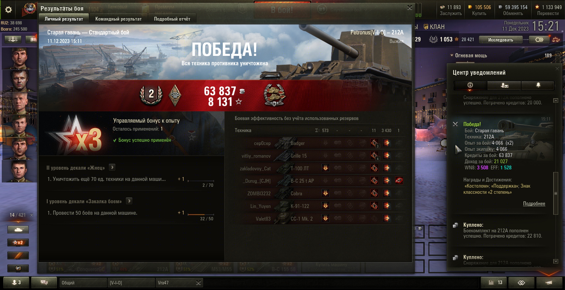 Победа! Бой: Старая гавань, Техника: 212А, Старая гавань, 3430урон, 1фраг Опыт за бой: 4 066 (x2) , Опыт экипажу: 4 066, Кредиты за бой: 63 837, Доход за бой: 21 027, WN8: 3 508, EFF: 1 528, Награды и Достижения: «Костолом»; «Поддержка»; Знак классности «2 степень»