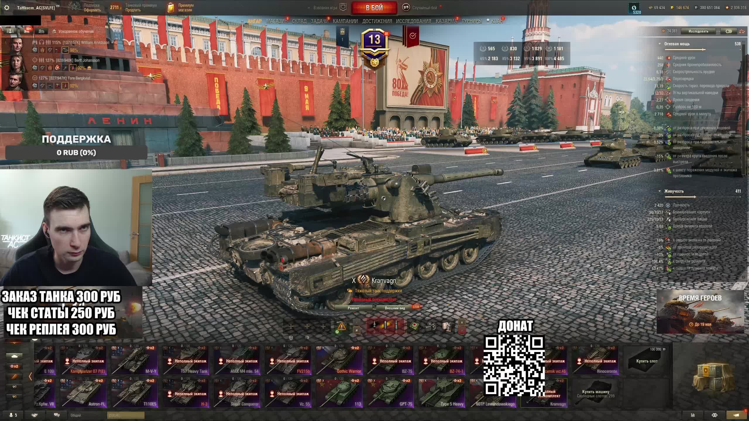 Поддержать стримера http://www.donationalerts.ru/r/tahkucm_ac Сбер без комиссии 2202 2062 2408 9735 напишите в чате, чтобы проверил Telegram https://t.me/TaHkucm_AC Канал VK Play Live https://vkplay.live/tahkucm Канал Бусти https://boosty.to/tahkucm Канал на трово https://trovo.live/TaHkucm_AC Канал Яндекс Дзен https://dzen.ru/id/62355e95d406852937d33526 Группа Вконтакте https://vk.com/tahkucm_ac Оборудование и модернизации на все танки https://docs.google.com/spreadsheets/d/16koQOrtKQKQrAy2Pgfm6GBeG8bA1tJP_7Vm78knwUXA/edit#gid=422106233 Настройки игры в скринах https://dzen.ru/a/YmFvHhJ9yi3rZO5M Моды со скринами установки https://vk.com/topic-136212047_47639792 По поводу рекламы писать в личку https://vk.com/v_xarlamow Всем привет! Меня зовут Виктор, мой ник TaHkucm_AC. На моем канале стрим мира танков каждый день с 8 или 9 по мск. Так же иногда стримлю вечером в произвольное время, чтобы не пропустить подпишитесь на оповещения в телеге или вк (ссылки выше). Играю в танки с декабря 2011 года, а стримить начал в начале 2017 года. Во время стримов общаюсь с чатом, помогаю советами по игре, объясняю тактику. Средняя статистика 65% побед и 4-5к вн8. Фан кланы SLPFR - Командиры marmyn и artlay - из требований только то, чтобы вы часто играли в танки. Укреп 10 уровня. Участвуют в ивентах на ГК, как минимум чтобы собрать пропуск на аукцион. L-DS - Командир DarkSpawn13. Укреп 10 уровня, плюхи по кд SVLFE - Командир Shadowlions. Требуется Team Speak (программа связи) для взводов и клановых покатушек. Участвуют в ивентах на ГК, как минимум чтобы собрать пропуск на аукцион. укреп 10 уровня