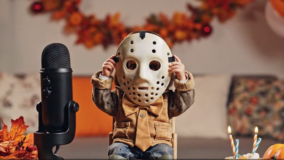 Промт Высококачественное кинематографичное видео 4K, 16:9. Светлая, праздничная гостиная/домашняя студия, украшенная к Хэллоуину. На аккуратном деревянном столе сидит миниатюрный (~20–25 см ростом) персонаж в рабочей куртке, старых резиновых ботинках и гладкой светлой маске без символов (несколько круглых отверстий для дыхания, узкая щель у рта; форма обобщённая, не привязана к спорту/командам/брендам). Маска похожа на маску Джейсона Вурхиса —психа. Вокруг — осенние листья, оранжево-чёрные шары, маленькие декоративные тыквы и бумажные летучие мыши; на заднем плане мягко размытые полки и окно с неразборчивой гирляндой. Никакого читаемого текста нигде (никаких букв/цифр и логотипов). Камера: один непрерывный средний крупный план на уровне стола, стабильная «TV-style», малая глубина резкости; в фокусе лицо персонажа (маска), стационарный профессиональный микрофон на короткой стойке перед ним и край стола с небольшой стопкой карточек/блокнотов (обложки нечитаемые) и карандашом, маленький букет осенних листьев и мини-тыква на столе. Действие (смешно): персонаж уверенно сидит, короткие ножки забавно свисают со стула; он пытается придать себе «суровый» вид, но маска слегка норовит сползти — он ловко поддёргивает её, поправляет нелепо большую бабочку/галстук поверх куртки, кивает, смотрит прямо в камеру и произносит по-русски: «Сегодня Хэллоуин! Пусть вся нечисть проходит мимо, а семья и друзья будут рядом.» — и дружелюбно улыбается глазами; на маске еле заметно приподнимаются щёки. Липсинк: благодаря узкой щели у рта движения рта и мимика под маской идеально синхронизированы с фразой; совпадение по слогам и движениям челюсти без рассинхрона. Аудио: чистый, тёплый голос на русском (доброжелательный, слегка «кинокомичный» тембр), ясная дикция; мягкий домашний амбиент (едва слышный шум улицы/ветра за окном, лёгкое шуршание шаров и бумаги). Музыки нет. Свет: тёплый дневной из окна + мягкая заполняющая подсветка; деликатные блики на маске и в глазах персонажа. Кадрирование: внимание полностью на персонаже, микрофоне и крае стола; фон остаётся мягко размытым. Ограничения: без субтитров, без текстовых оверлеев, без логотипов, без прямых отсылок к конкретной франшизе или имён персонажей.