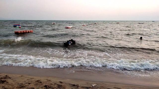 просто цвет заката - жёлто-розовый. берег, пальмы, волны
