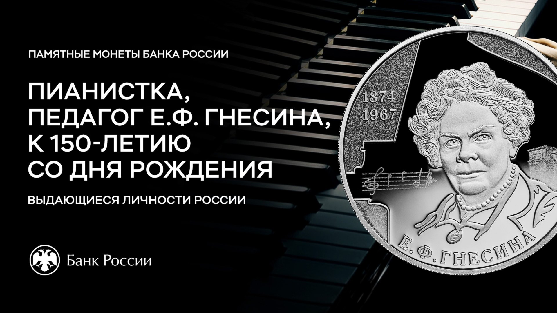 Банк России 24 апреля 2024 года выпускает в обращение памятную серебряную монету номиналом 2 рубля «Пианистка, педагог Е.Ф. Гнесина, к 150-летию со дня рождения». Монета выходит в серии «Выдающиеся личности России», тиражом – 3000 штук. Елена Гнесина – знаменитая пианистка и педагог. Вместе с сестрами в 1895 году она учредила в Москве музыкальную школу, которая за 72 года ее руководства превратилась в целый комплекс учебных заведений. Гнесинка – символ блестящего музыкального образования – хорошо известна всем, кто связал или собирается связать свою судьбу с музыкой. Подробнее: https://www.cbr.ru/press/pr/?file=638495561458572288COINS.htm Музыка: Андрей Иванович Головин