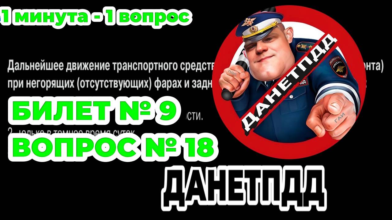 Билет № 9. Вопрос № 18. Дальнейшее движение транспортного средства (даже к месту стоянки или ремонта) при негорящих (отсутствующих) фарах и задних габаритных огнях запрещается: Решаем вопрос № 18 ПДД онлайн экзаменационного билета ГАИ № 9. ___________________________________________ 🔥 Вы можете поддержать канал по ссылке: https://clck.ru/3FeMWH ___________________________________________ ✅ ДАНЕТПДД в социальных сетях: YouTube: https://youtube.com/@danetpdd Rutube: https://rutube.ru/channel/51400104/ VK Видео: https://vkvideo.ru/@club228759945 ВКонтакте: https://vk.com/danetpdd Телеграм: https://t.me/danetpdd